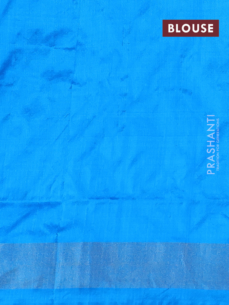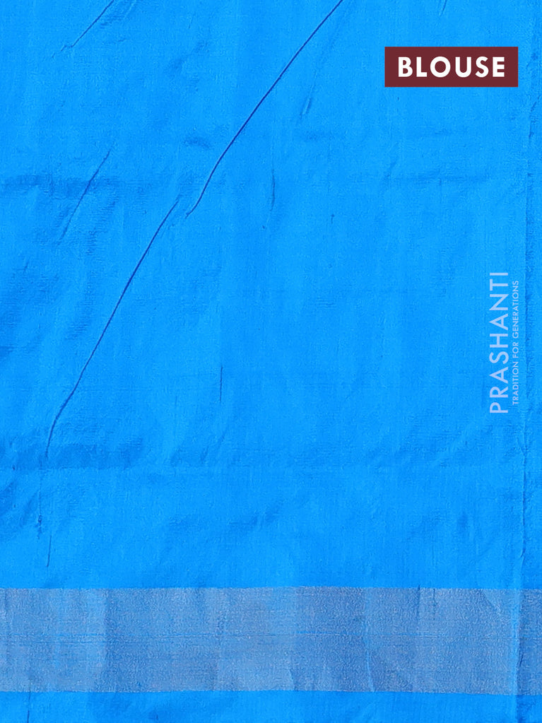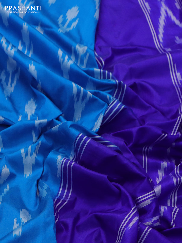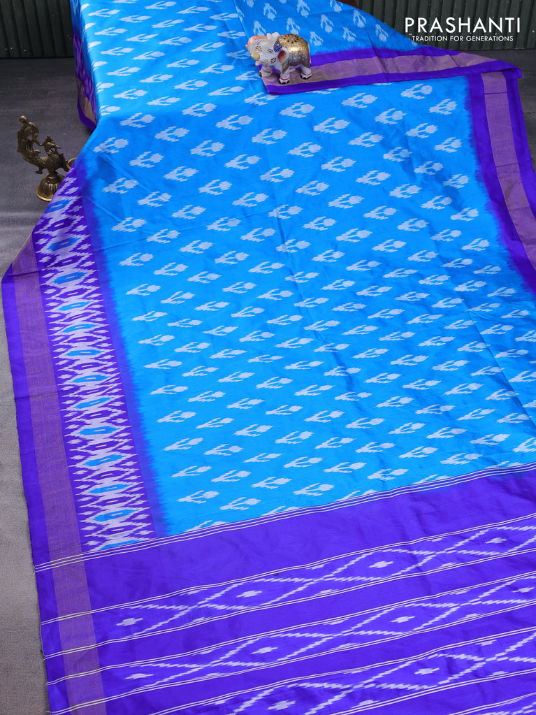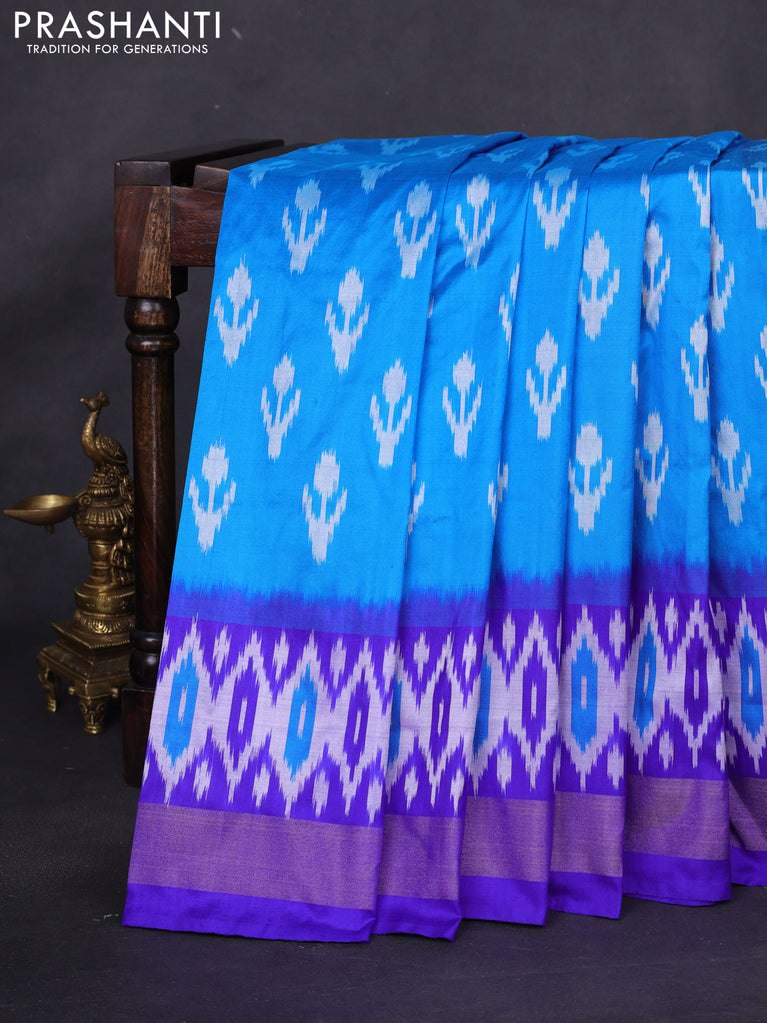 Pochampally silk saree cs blue and blue with allover ikat butta weaves and long zari woven ikat border