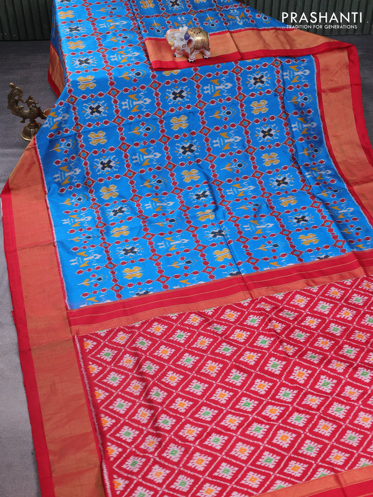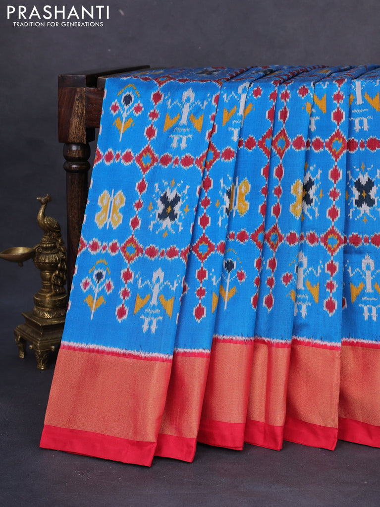 Pochampally silk saree cs blue and red with allover ikat butta weaves and long zari woven ikat border