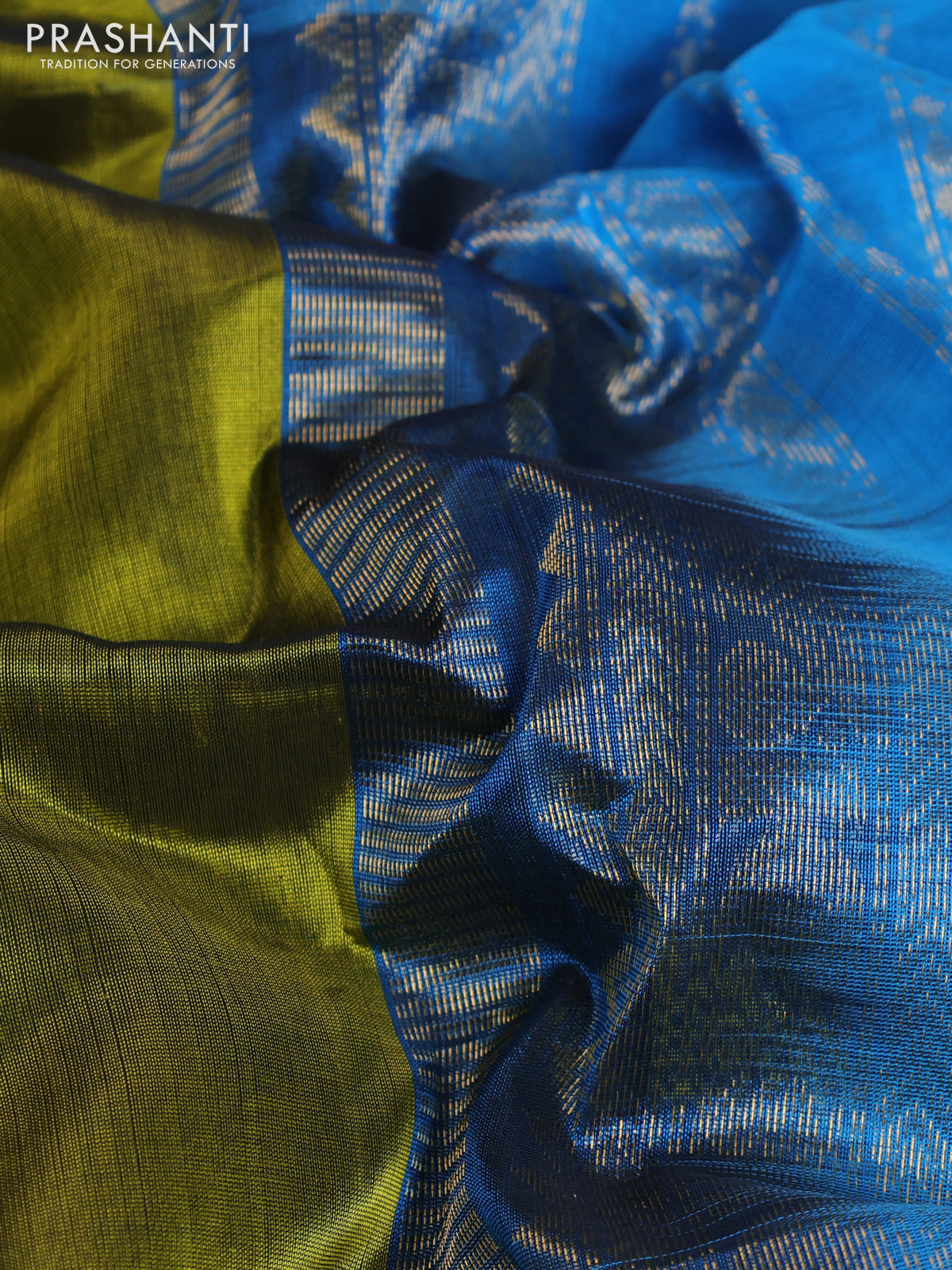 10 Yards silk cotton saree mehendi green and cs blue with plain body and zari woven korvai border