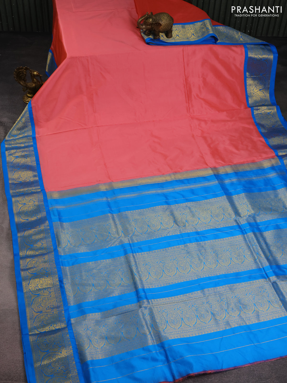 10 Yards silk saree peach pink and cs blue with plain body and zari woven border