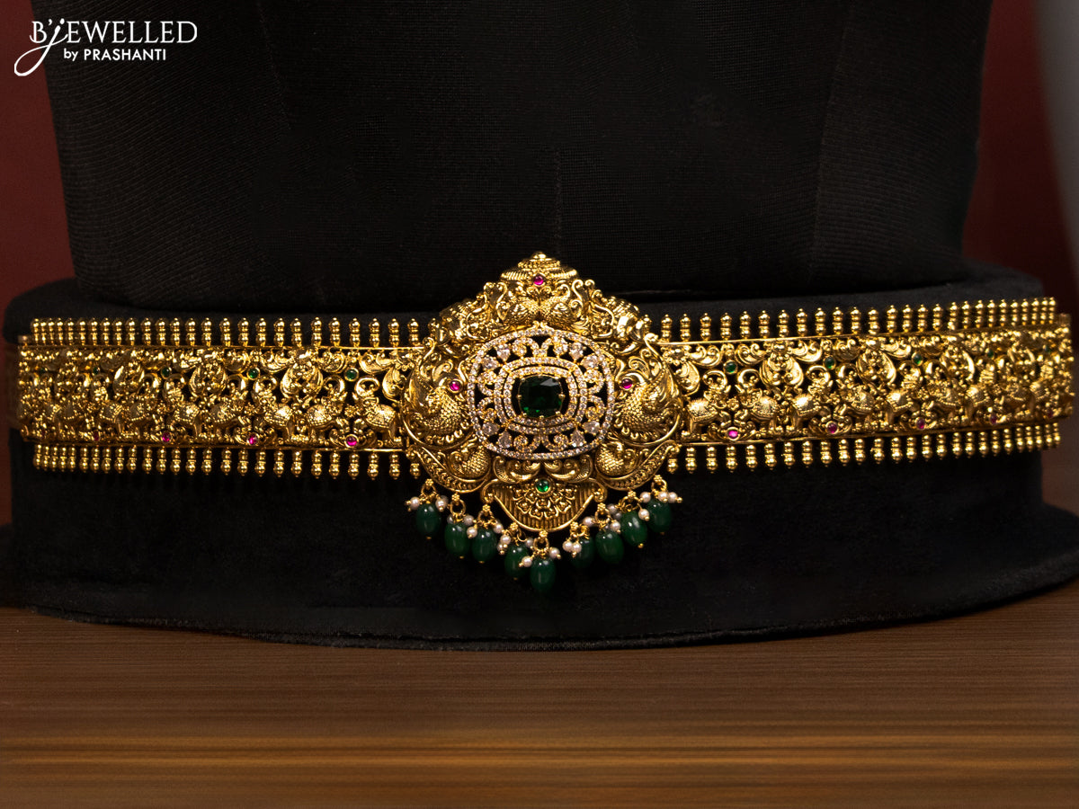 Antique double layer haaram with kemp & cz stones and green beads hanging