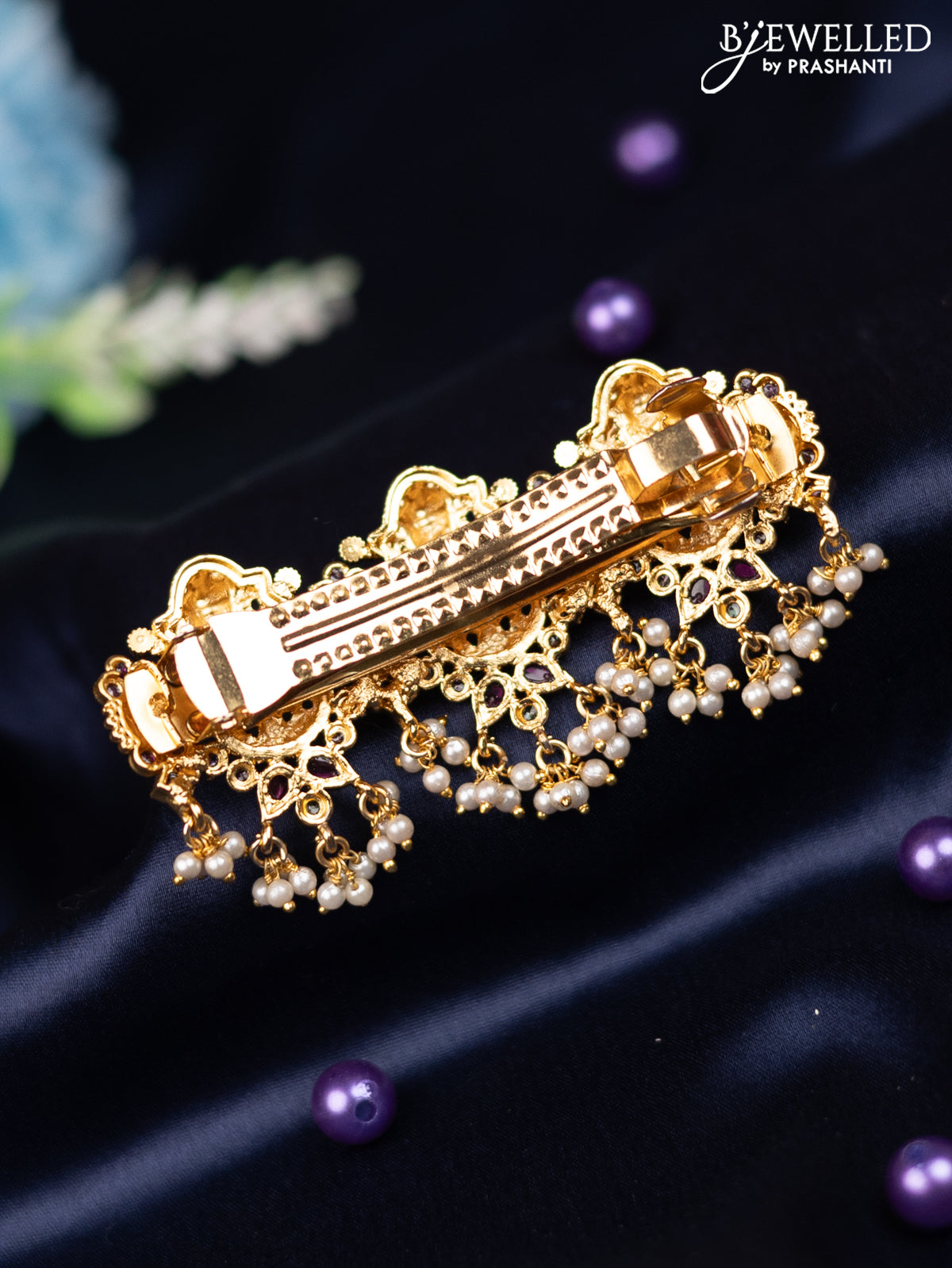 Antique hair clip medium size lakshmi design with kemp stones and pearl hangings