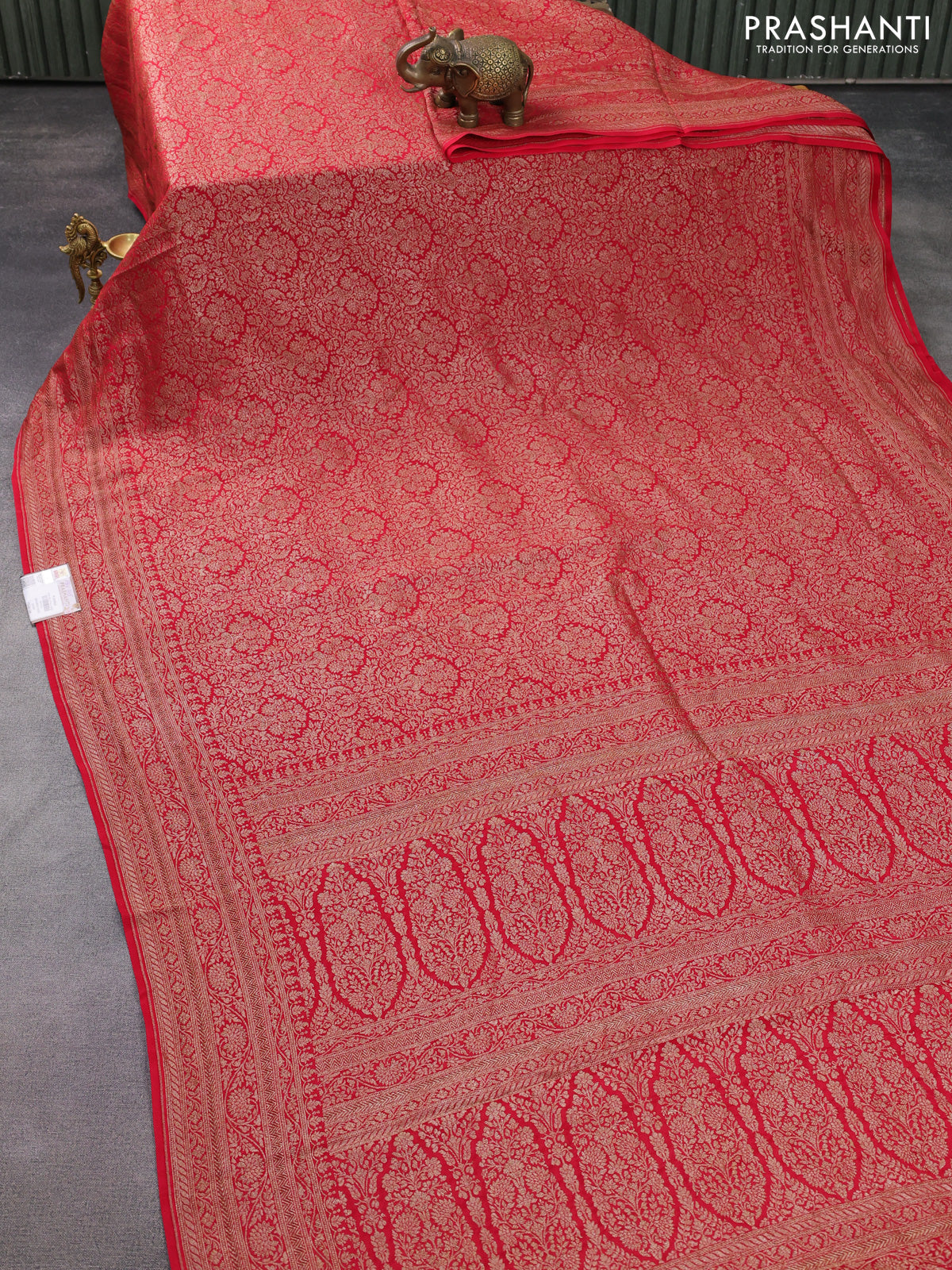 Banarasi crepe saree reddish pink with allover thread & zari woven brocade weaves and woven border