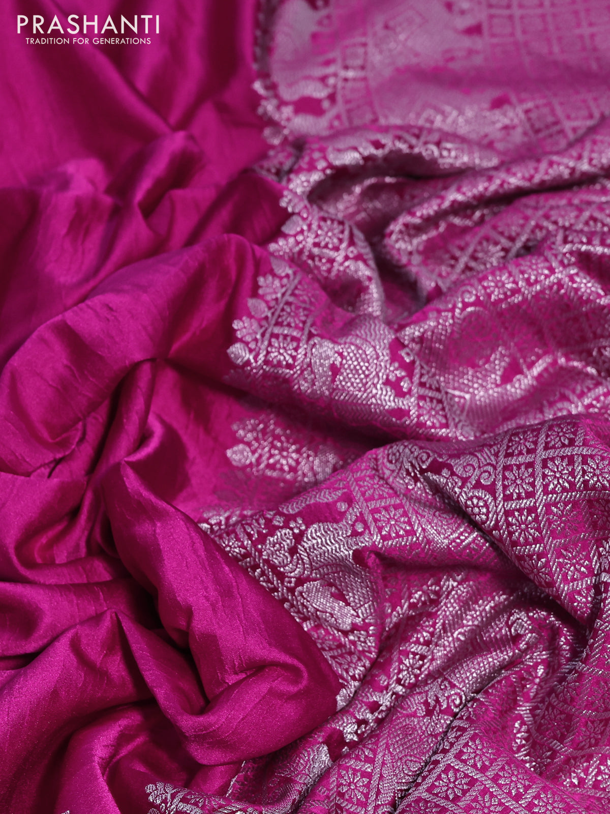 Banarasi crush crepe saree pink with plain body and silver zari woven elephant border