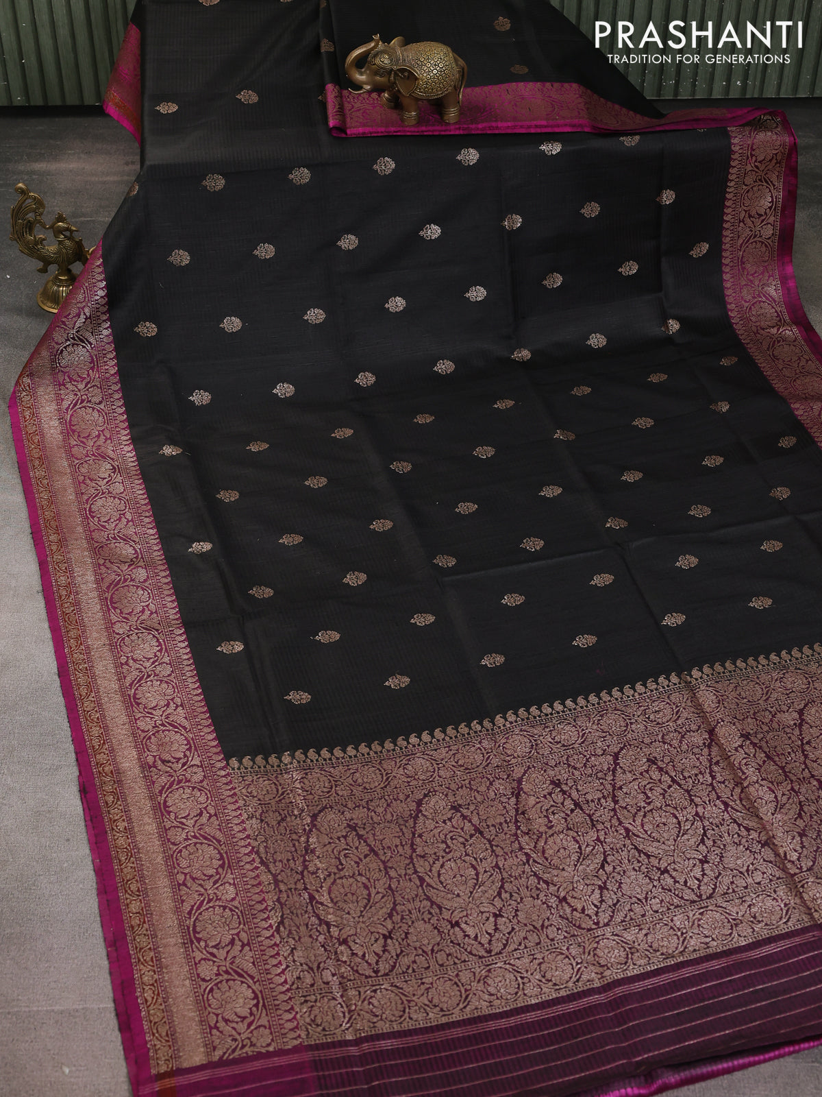 Banarasi dupion silk saree black and purple with thread & zari woven floral buttas and woven border