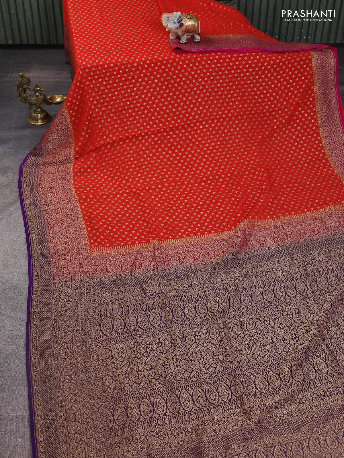 Banarasi georgette saree orange and pink violet with allover woven buttas and woven border