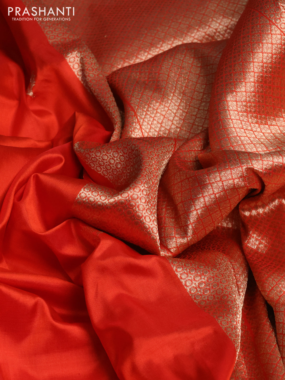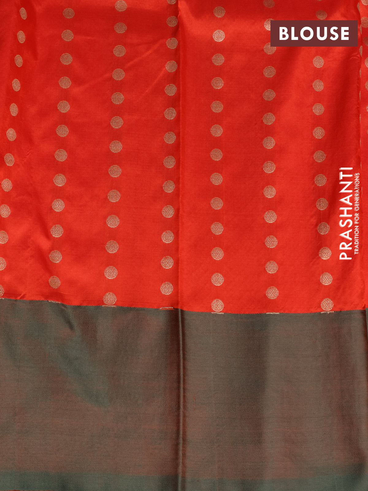 Banarasi katan silk saree reddish orange and greyish green with zari woven floral buttas and zari woven butta border