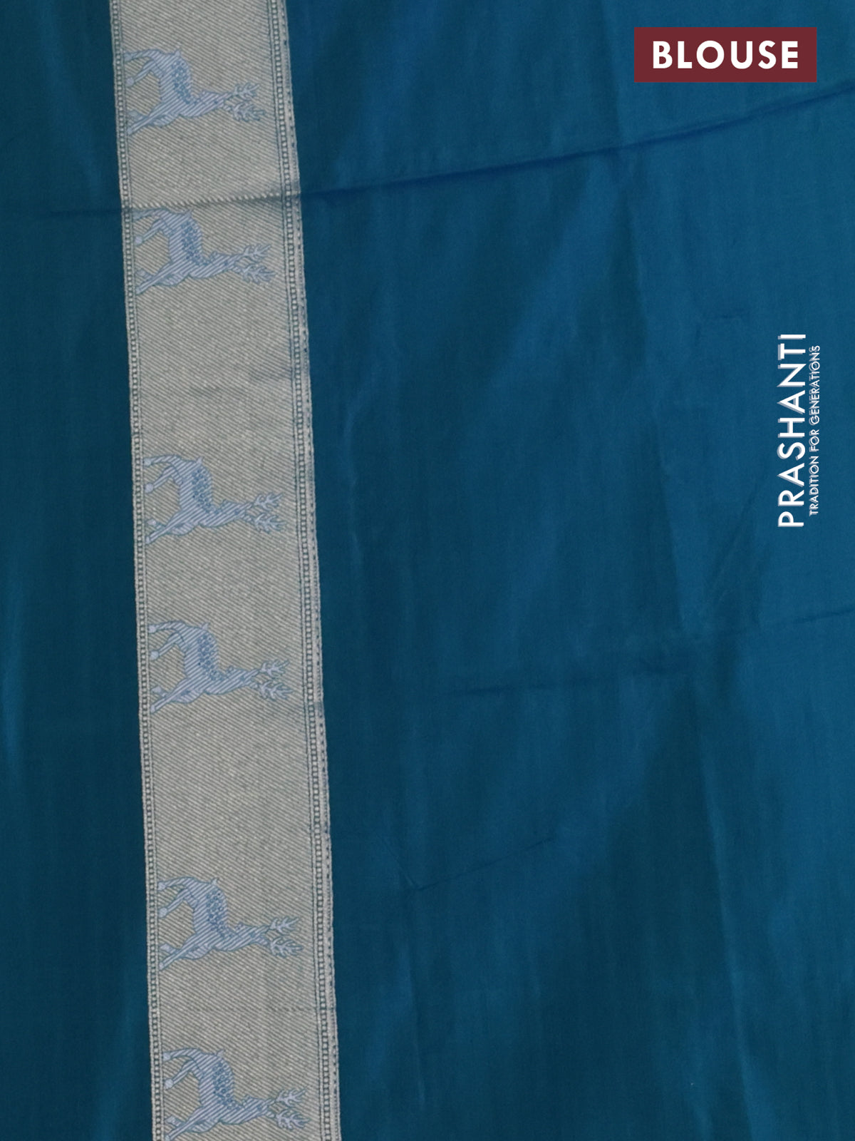 Banarasi semi katan silk saree dual shade of teal bluish green with allover silver & gold zari weaves and deer design zari woven border
