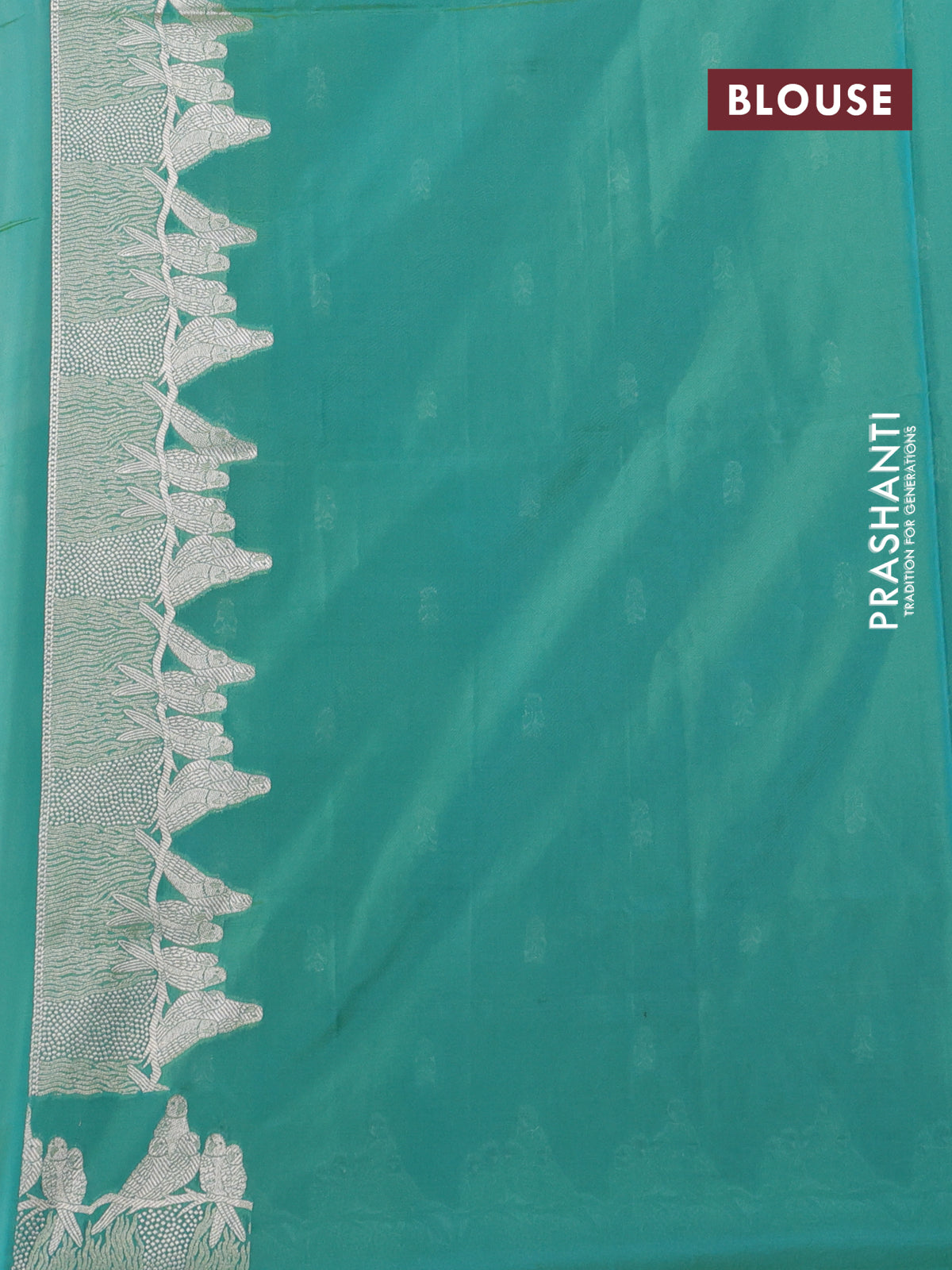 Banarasi semi katan silk saree dual shade of teal bluish green with allover zari woven buttas and parrot design zari woven border