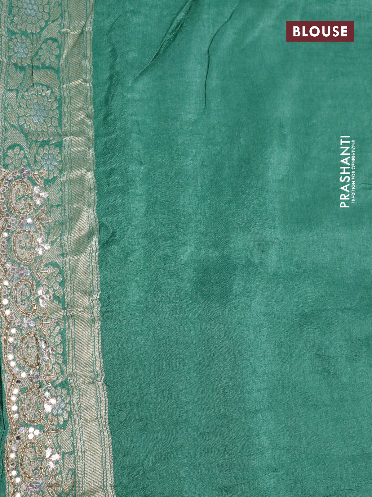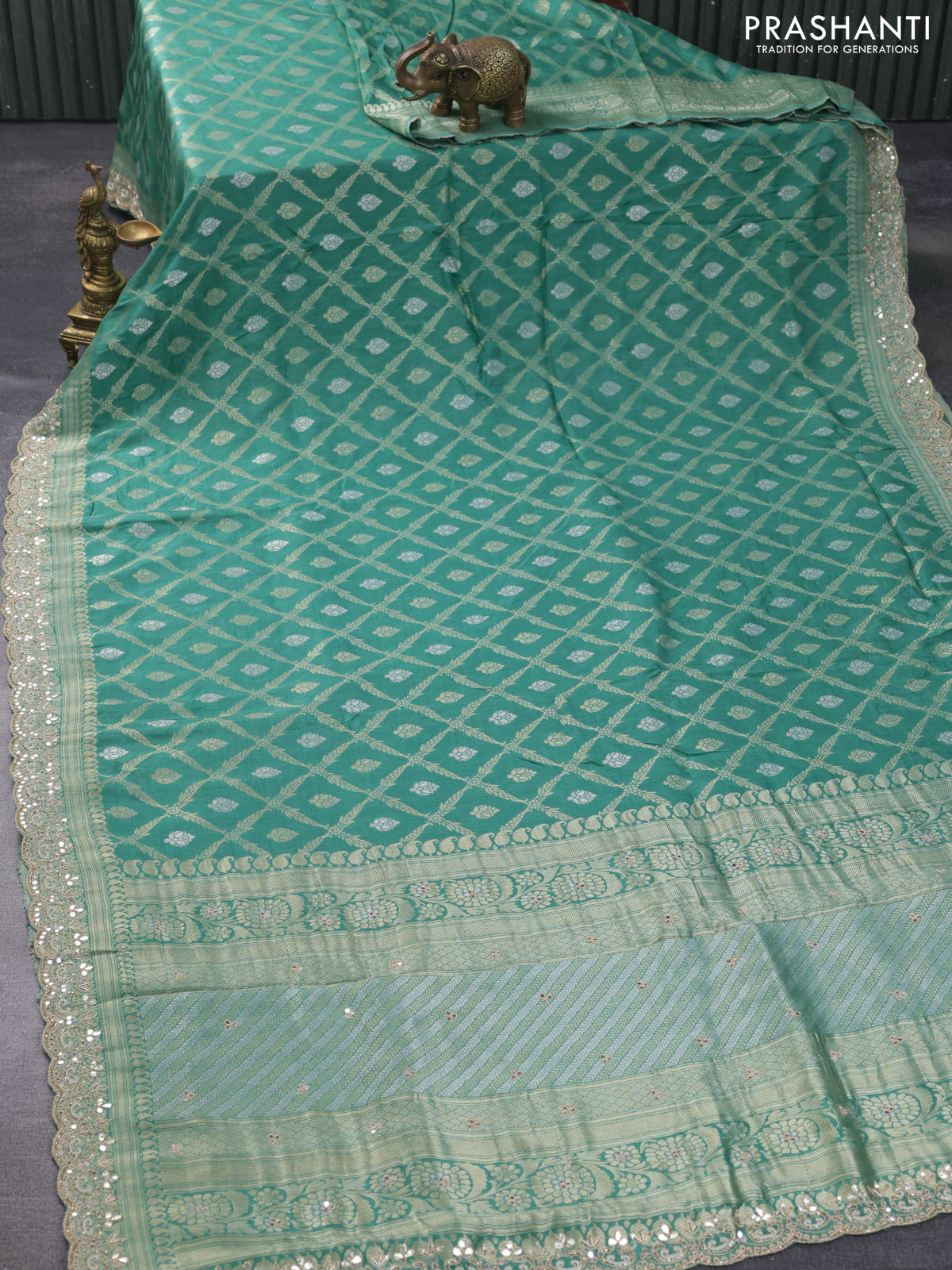Banarasi silk saree teal green shade with allover banarasi zari weaves and gotapatti lace work border