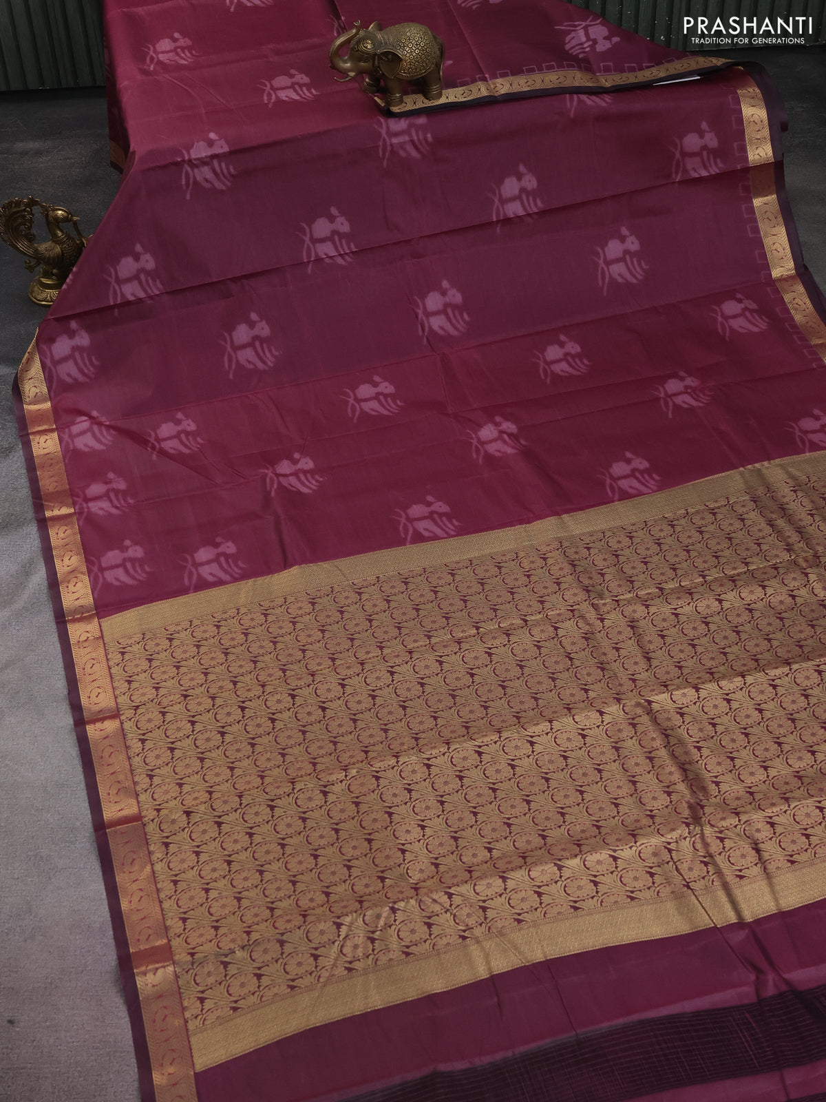 Bangalori semi silk saree wine shade with allover ikat butta weaves and zari woven border