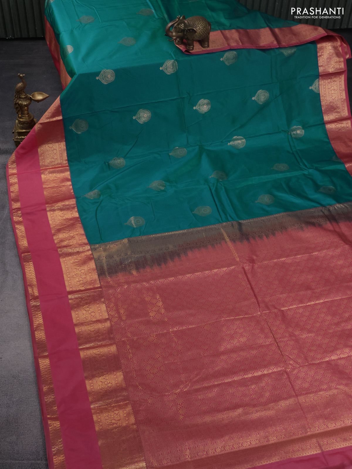 Bangalori silk saree teal blue and pink shade with zari woven buttas and rettapet zari woven border