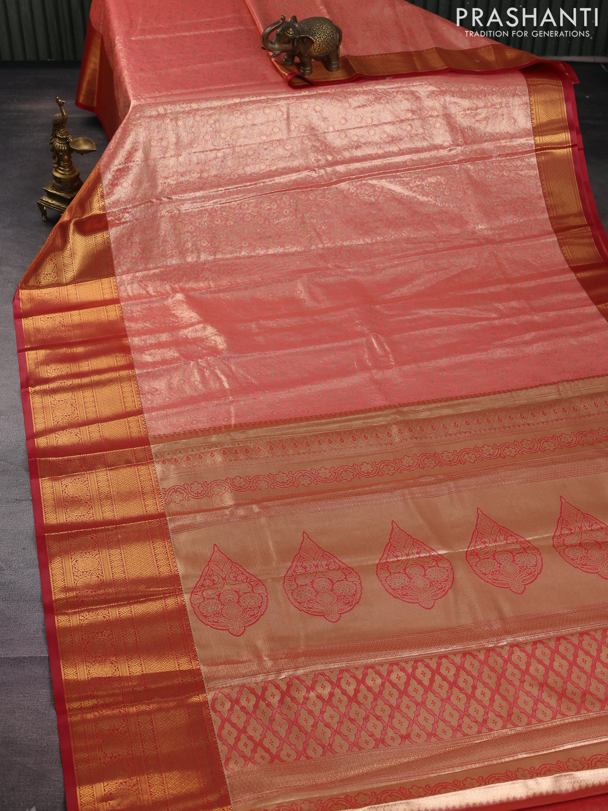 Bangalori tissue silk saree peach pink and red with allover zari woven brocade weaves and long zari woven border