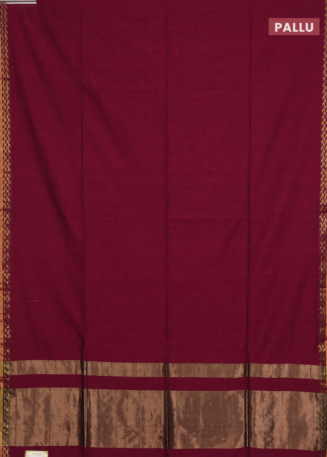 Bengal soft cotton saree dark magenta pink and green with plain body and zari woven border