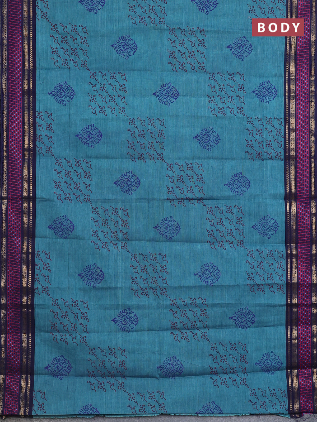 Chettinad cotton saree blue shade and navy blue with allover prints and thread & zari woven border