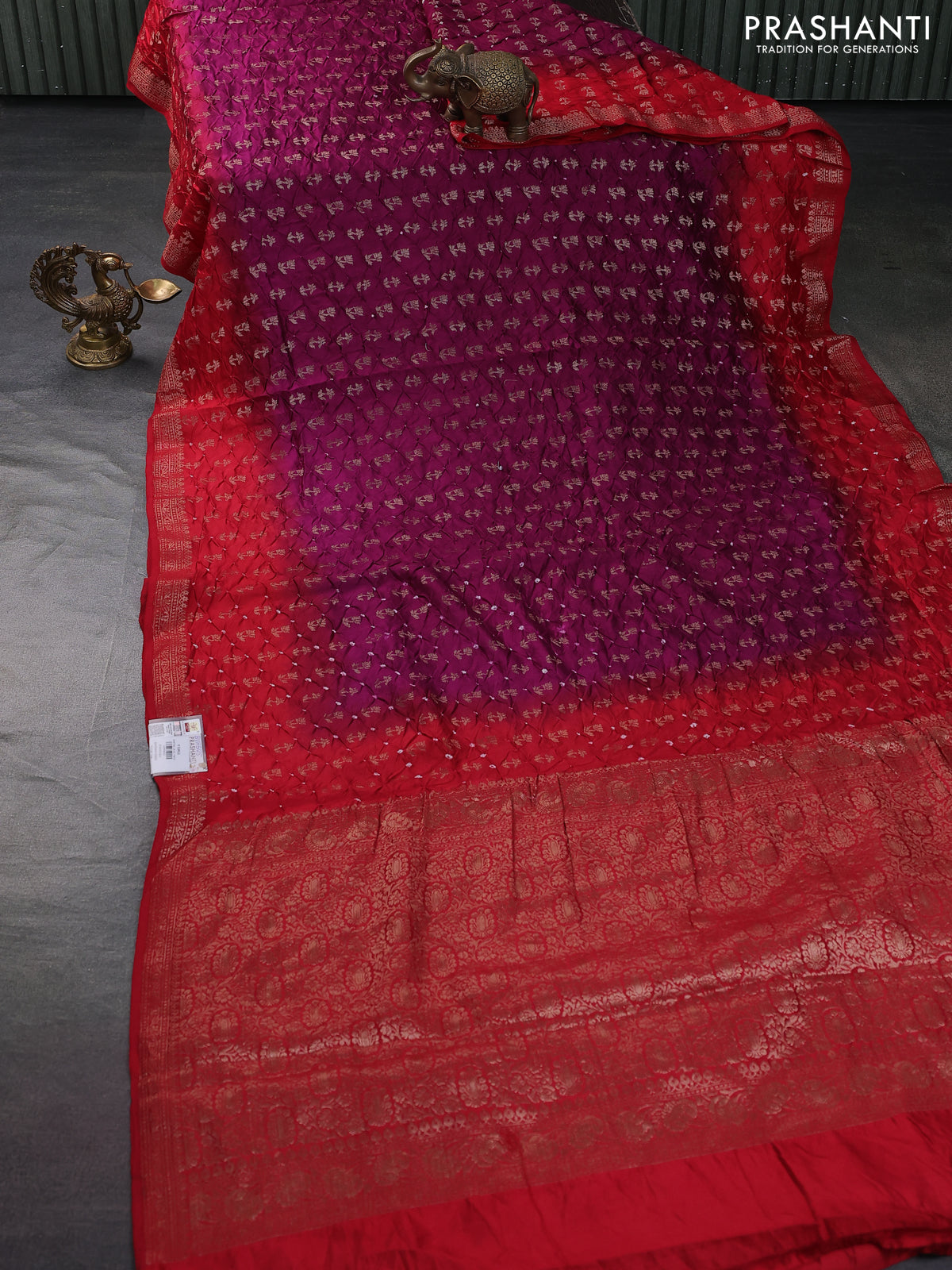 Chiniya silk saree purple and red with allover bandhani prints & zari weaves and zari woven border