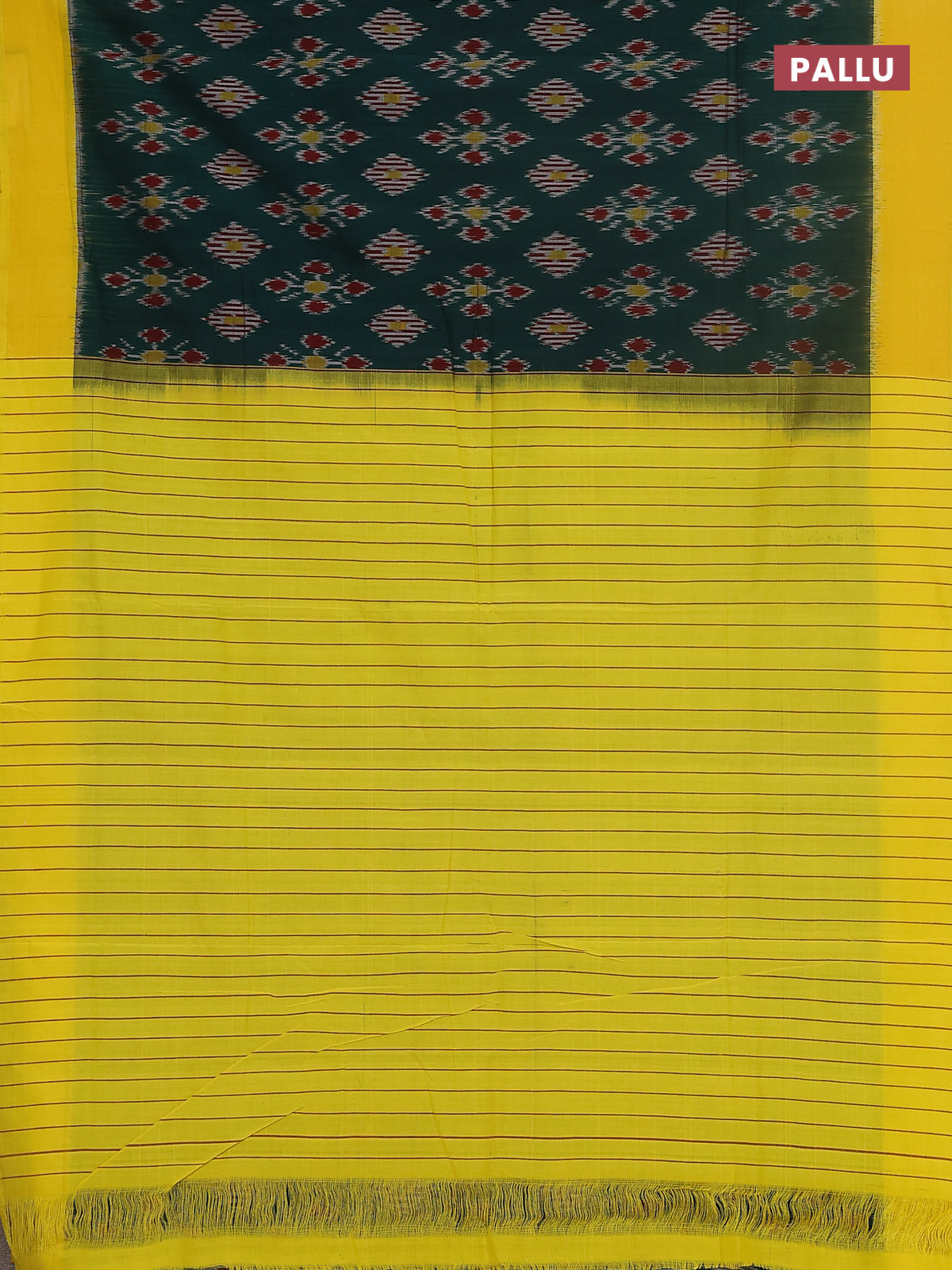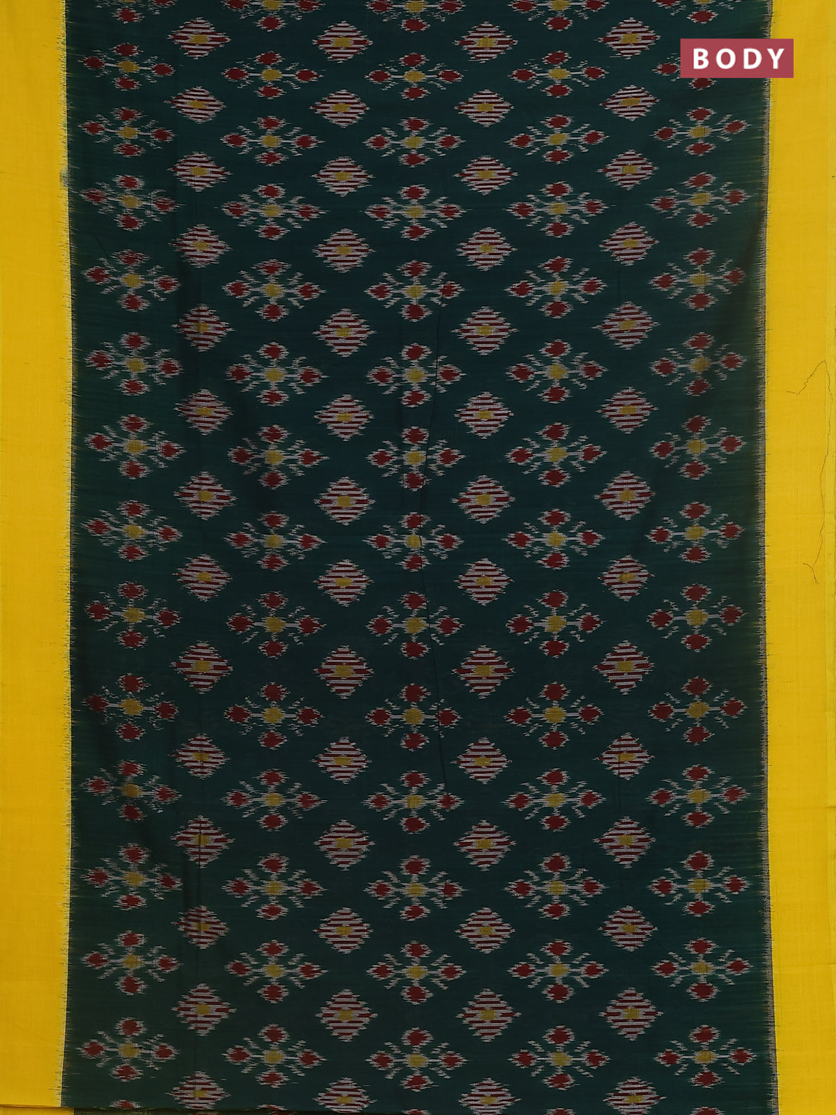 Ikat cotton saree bottle green and yellow with allover ikat butta weaves and simple border