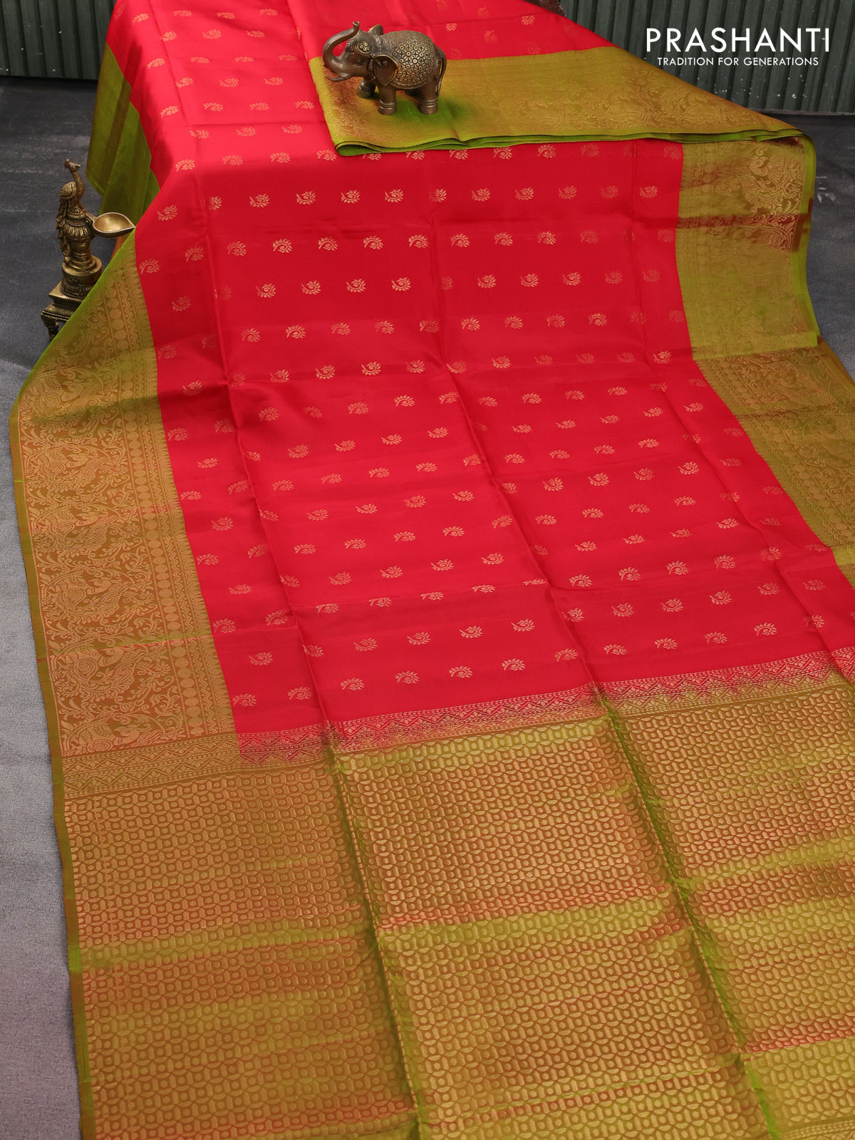 Kanchipuram soft silk saree red and dual shade of greenish red with allover zari woven buttas and long zari woven border