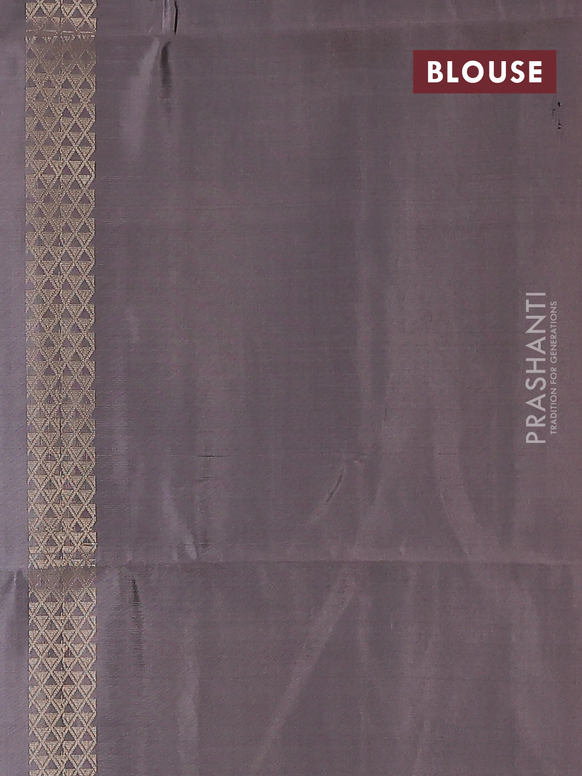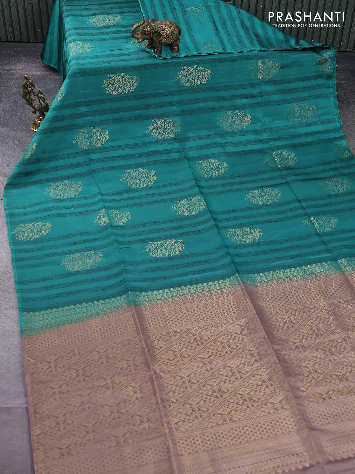 Kanchipuram soft silk saree teal green and pastel brown with zari buttas & jute finish in borderless style