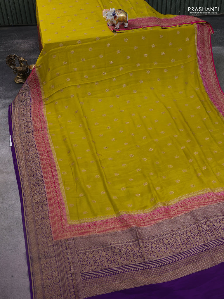 Banarasi crepe saree lime yellow and pink violet with woven buttas and long woven border