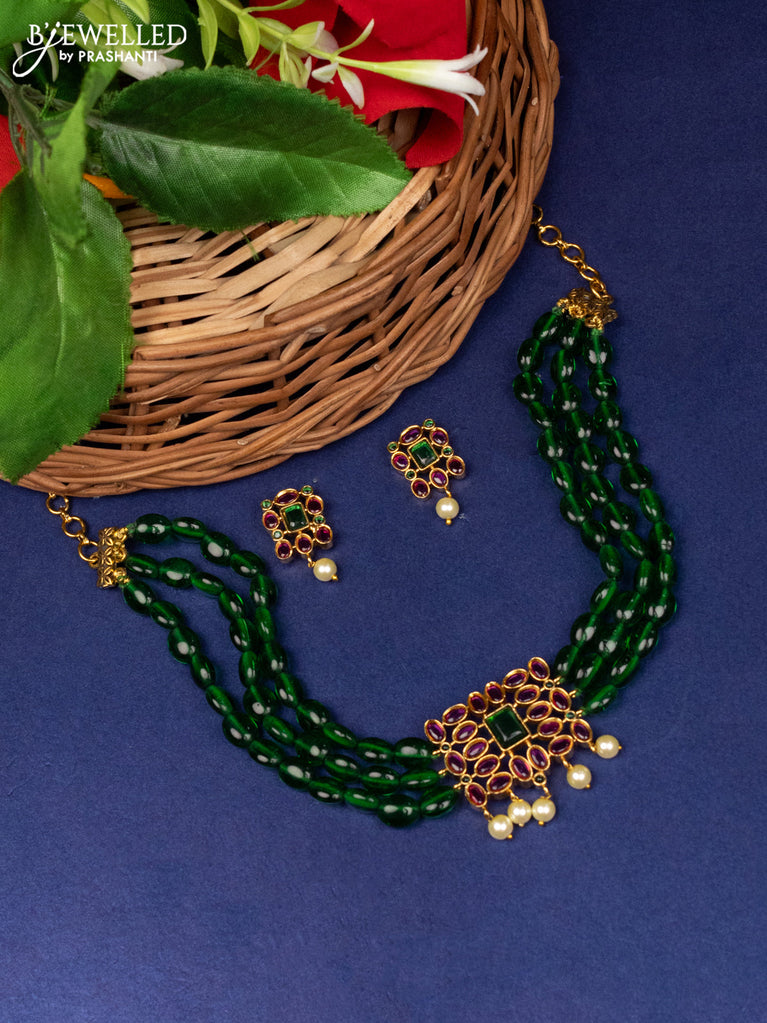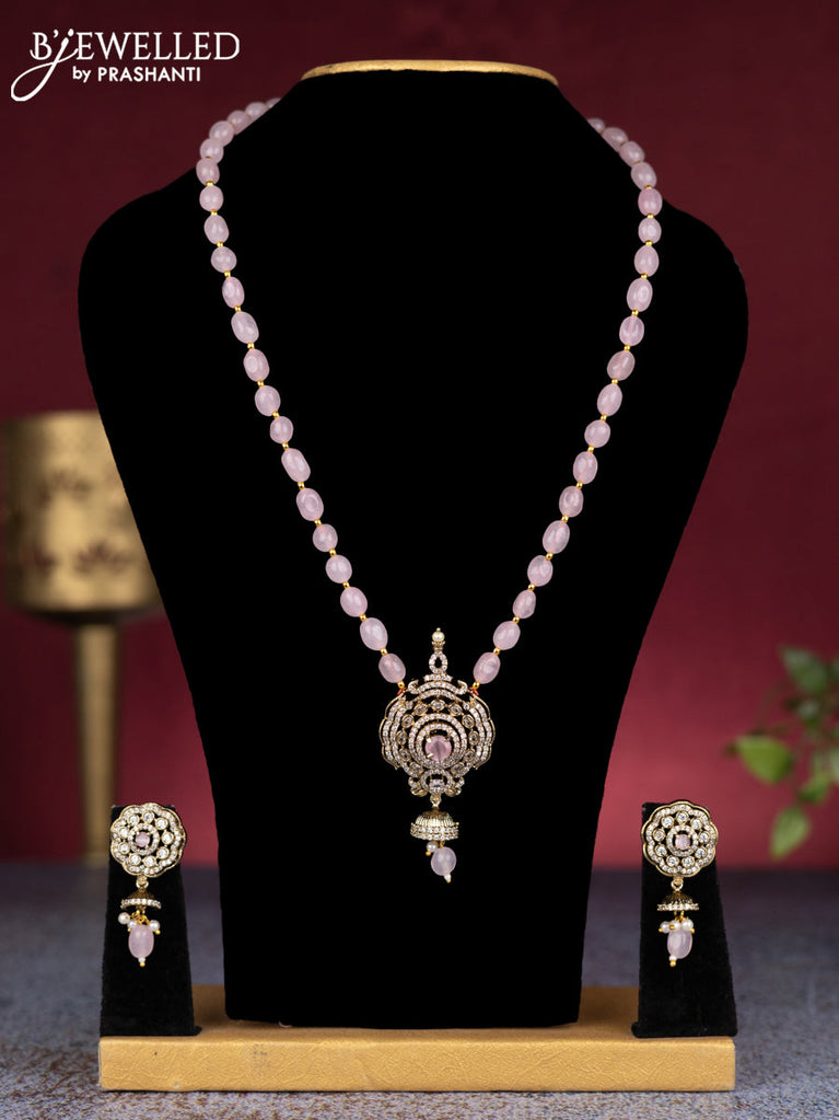 Beaded baby pink necklace with cz stones and pearl & beads hangings in victorian finish