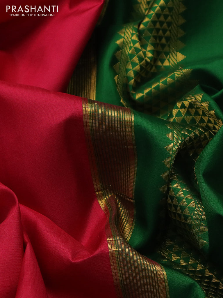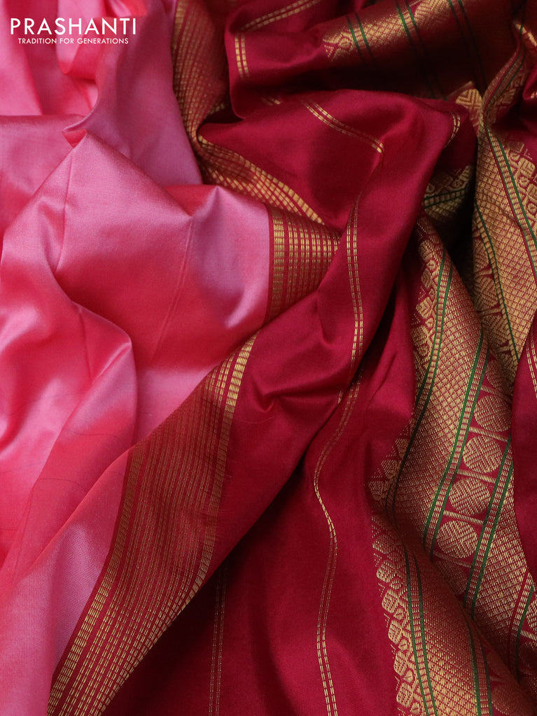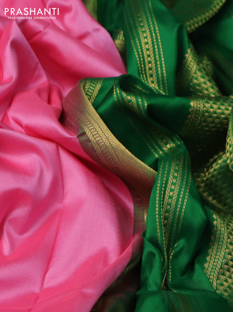 10 yards silk saree dark pink and green with plain body and zari woven korvai border