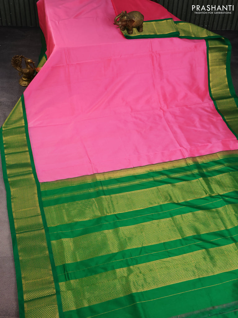 10 Yards silk saree green and pink with plain body and zari woven border
