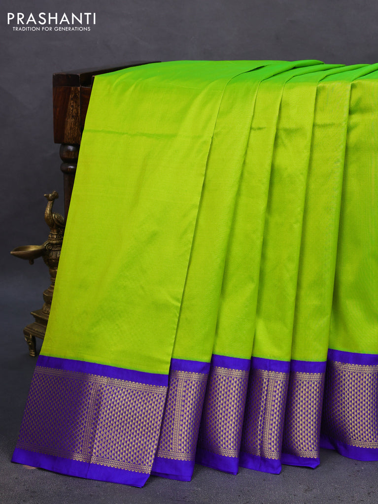 10 Yards silk saree fluorescent green and blue with plain body and zari woven border