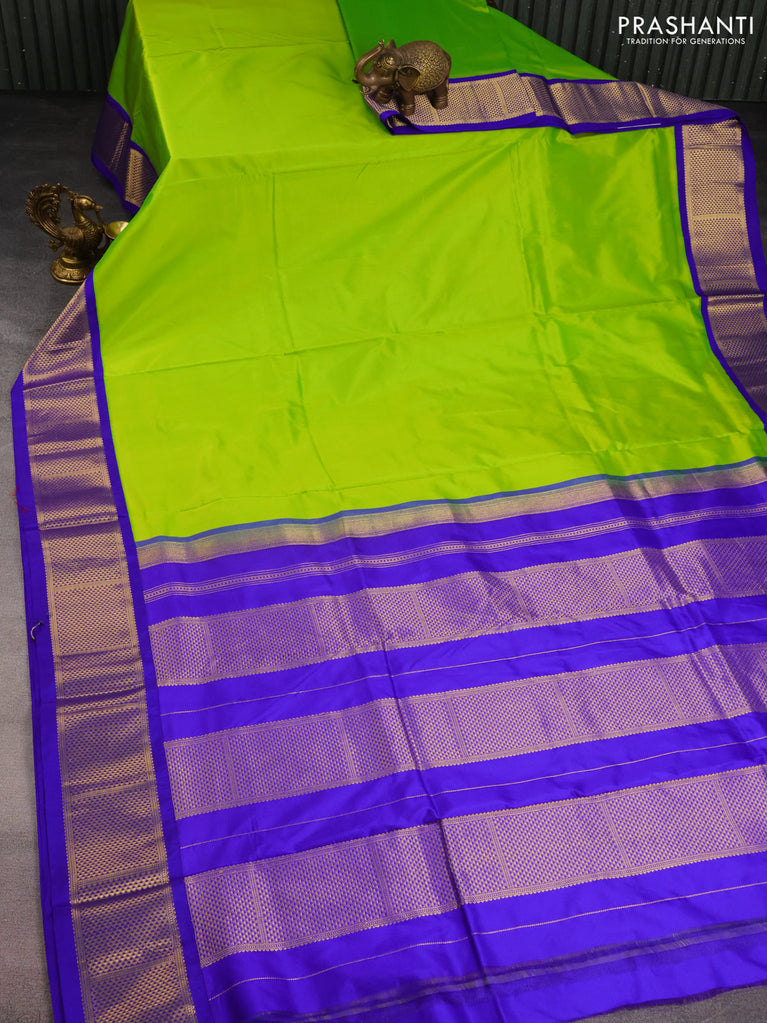 10 yards silk saree green and deep violet with plain body and temple design zari woven border
