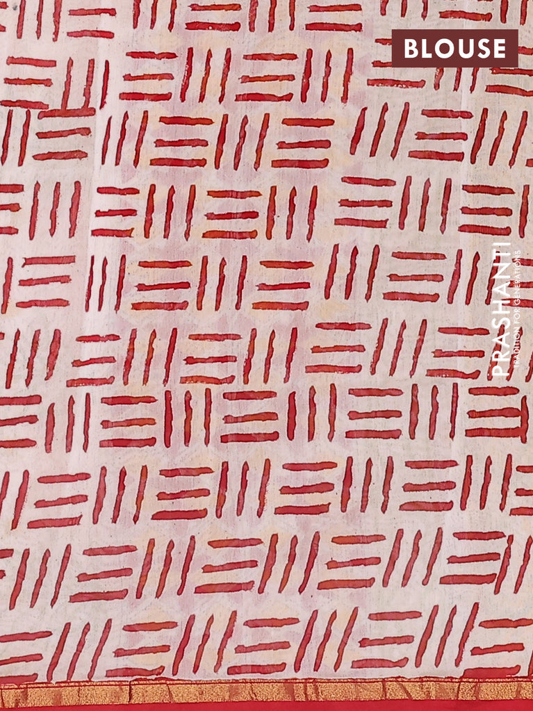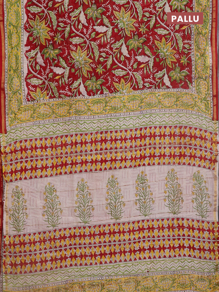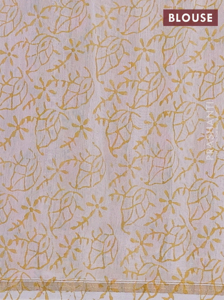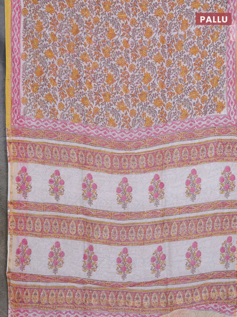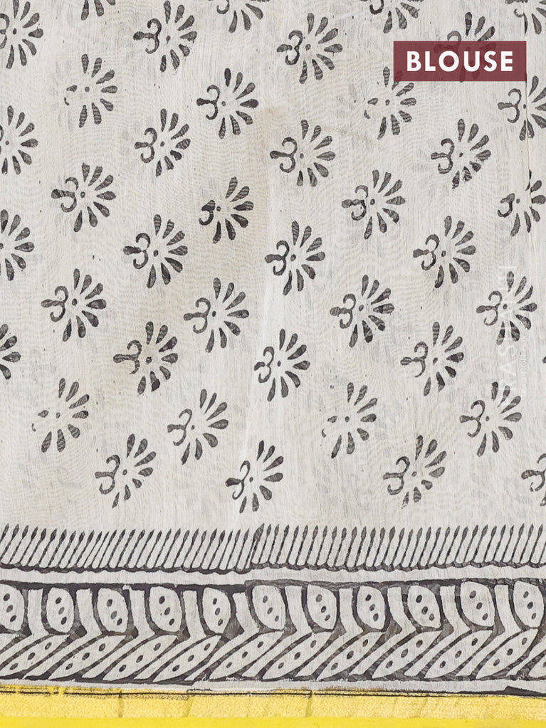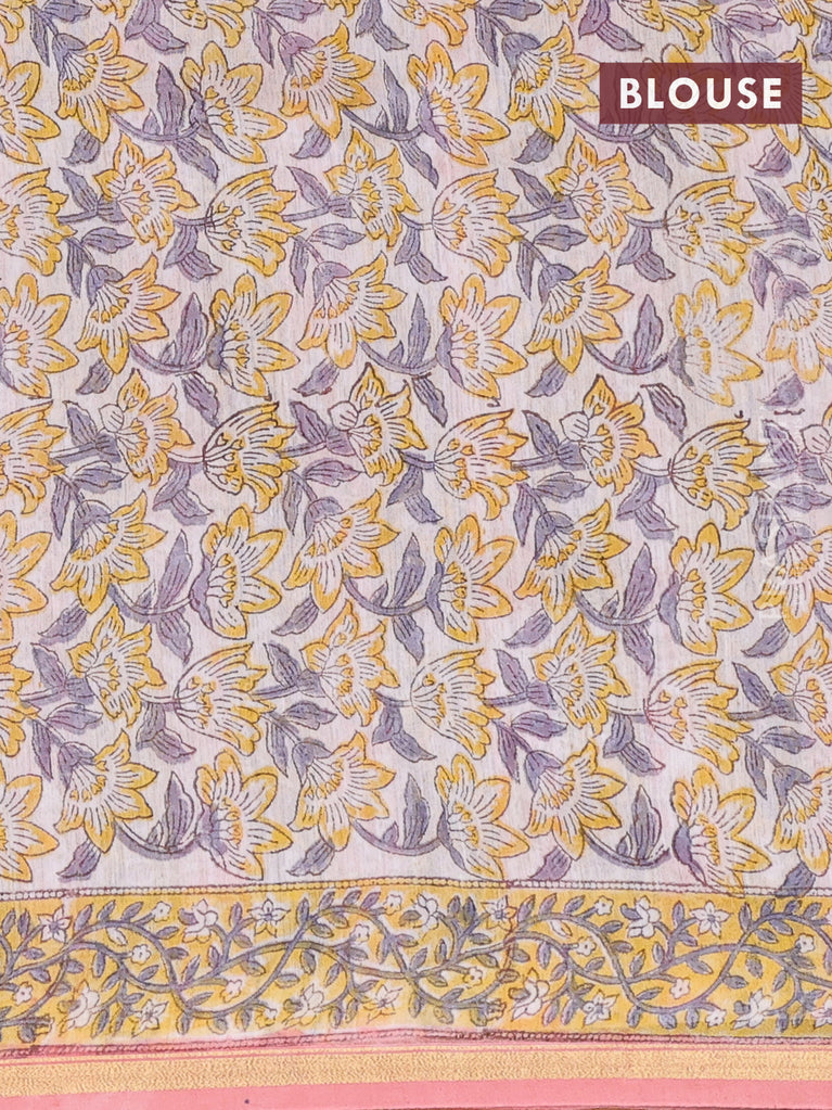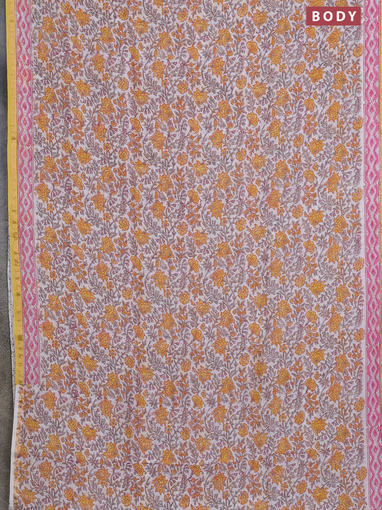 Chanderi bagru saree off white and yellow with allover floral prints and small zari woven border