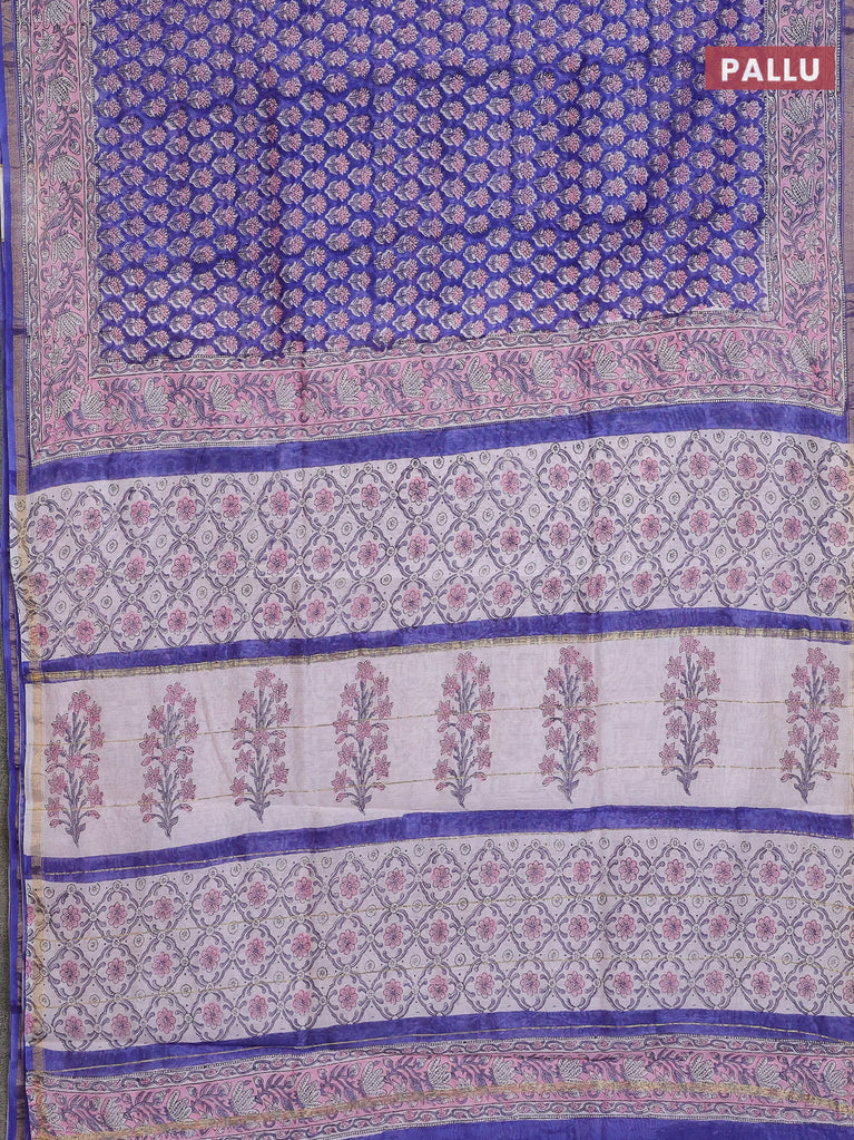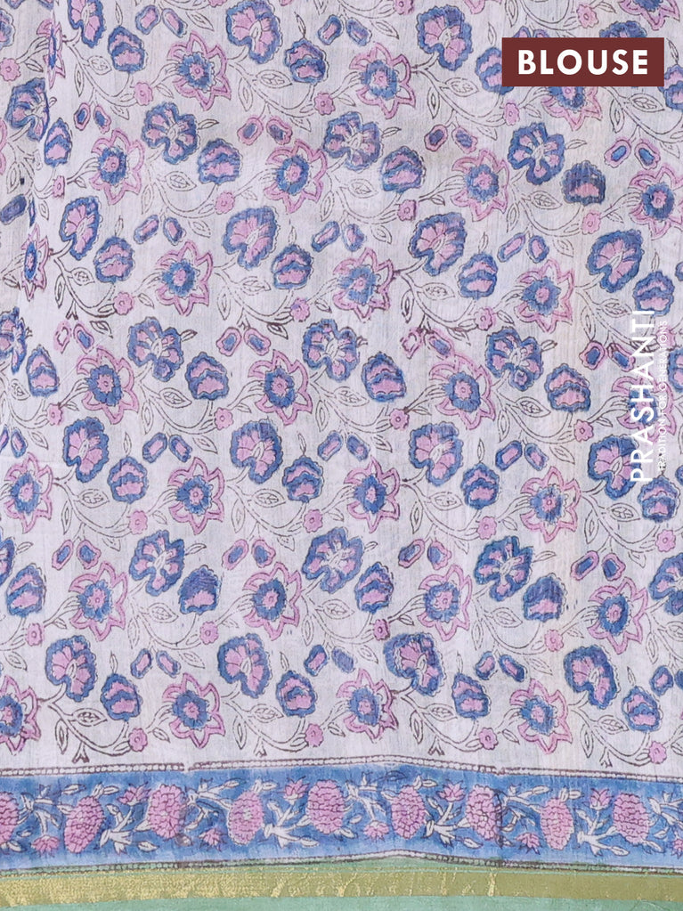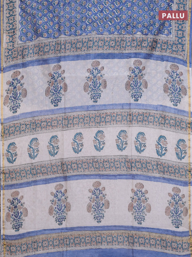 Chanderi bagru saree blue shade and off white with floral butta prints and small zari woven border
