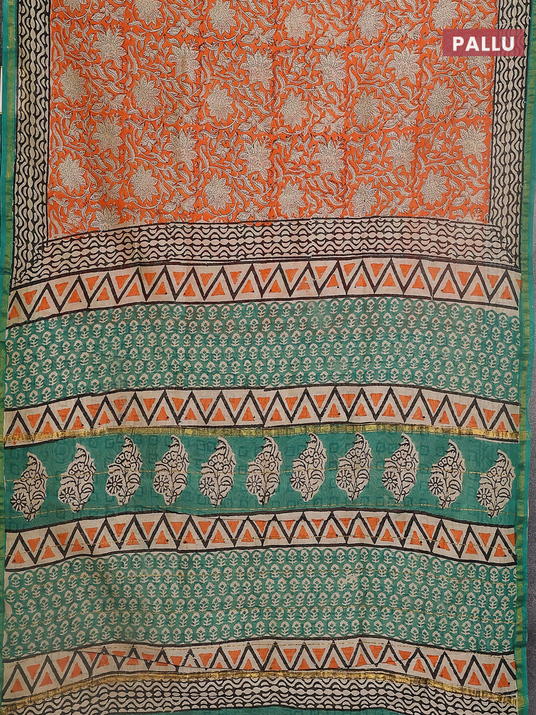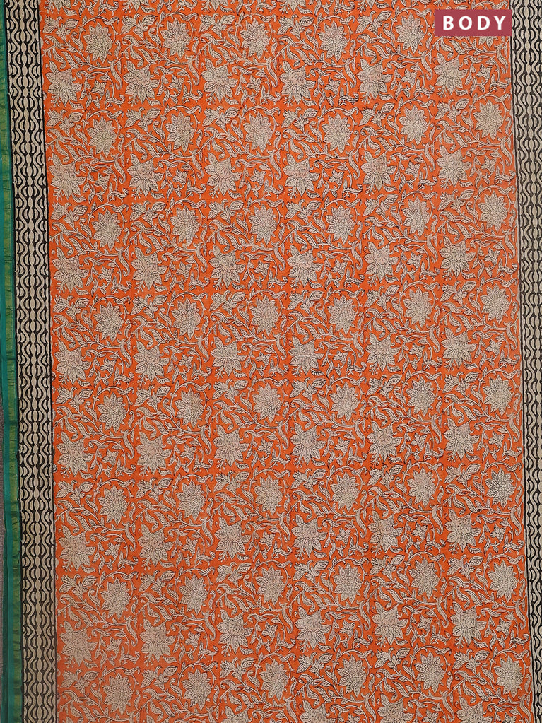 Chanderi bagru saree orange and beige teal green with allover kalamkari prints and small zari woven border