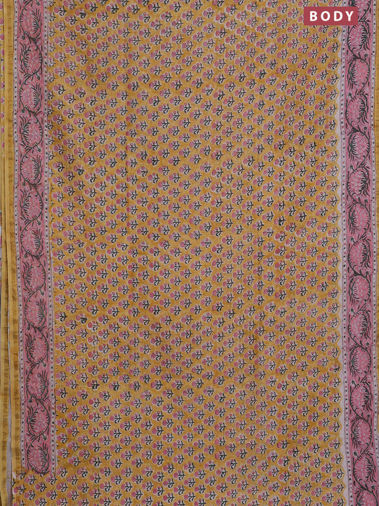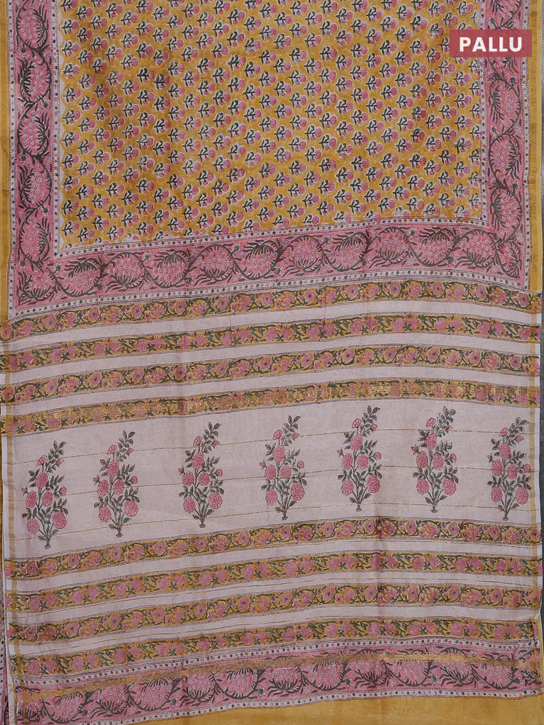 Chanderi bagru saree mustard yellow and peach pink with allover floral butta prints and small zari woven border