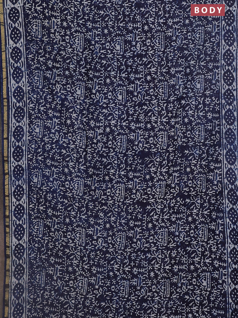 Chanderi bagru saree indigo blue and off white with allover batik prints and small zari woven border