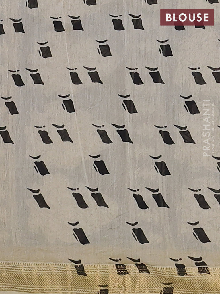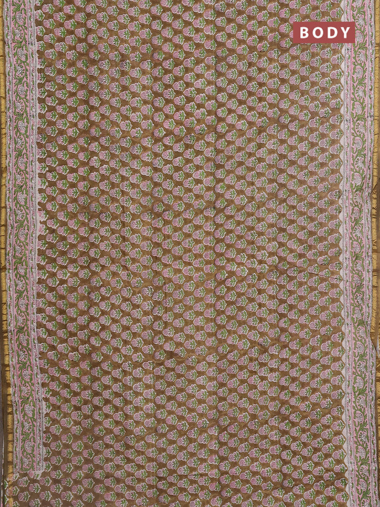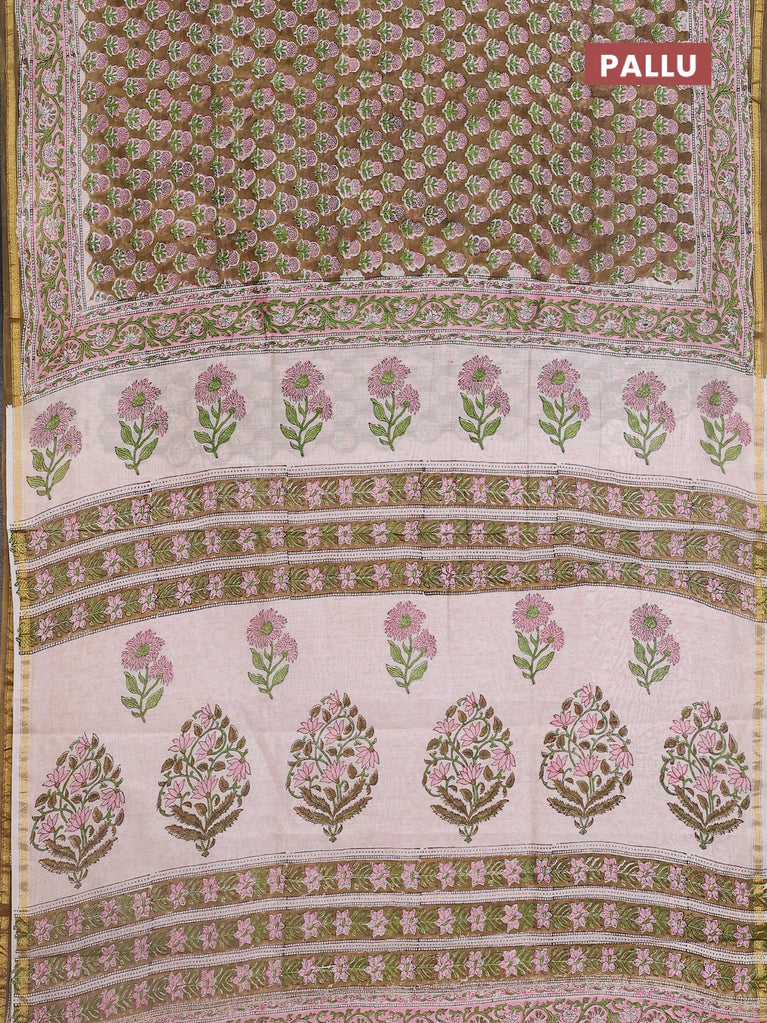 Chanderi bagru saree mehendi green and off white with floral butta prints and small zari woven border