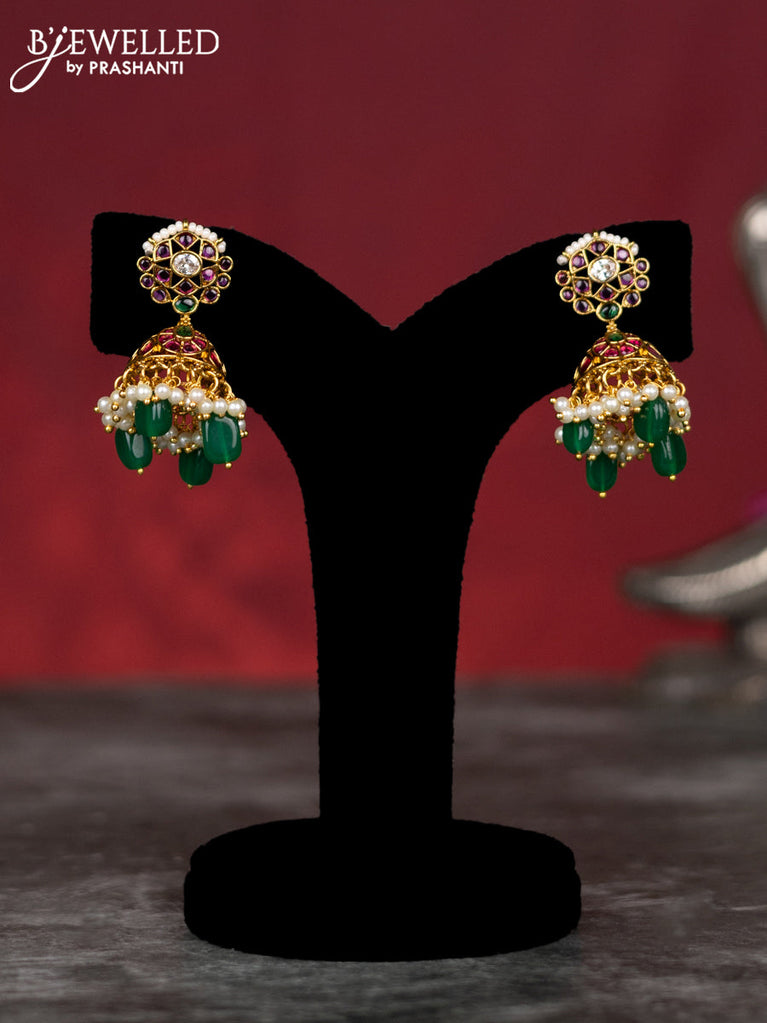 Antique earrings peacock design with kemp & cz stones and pearl & green beads hangings