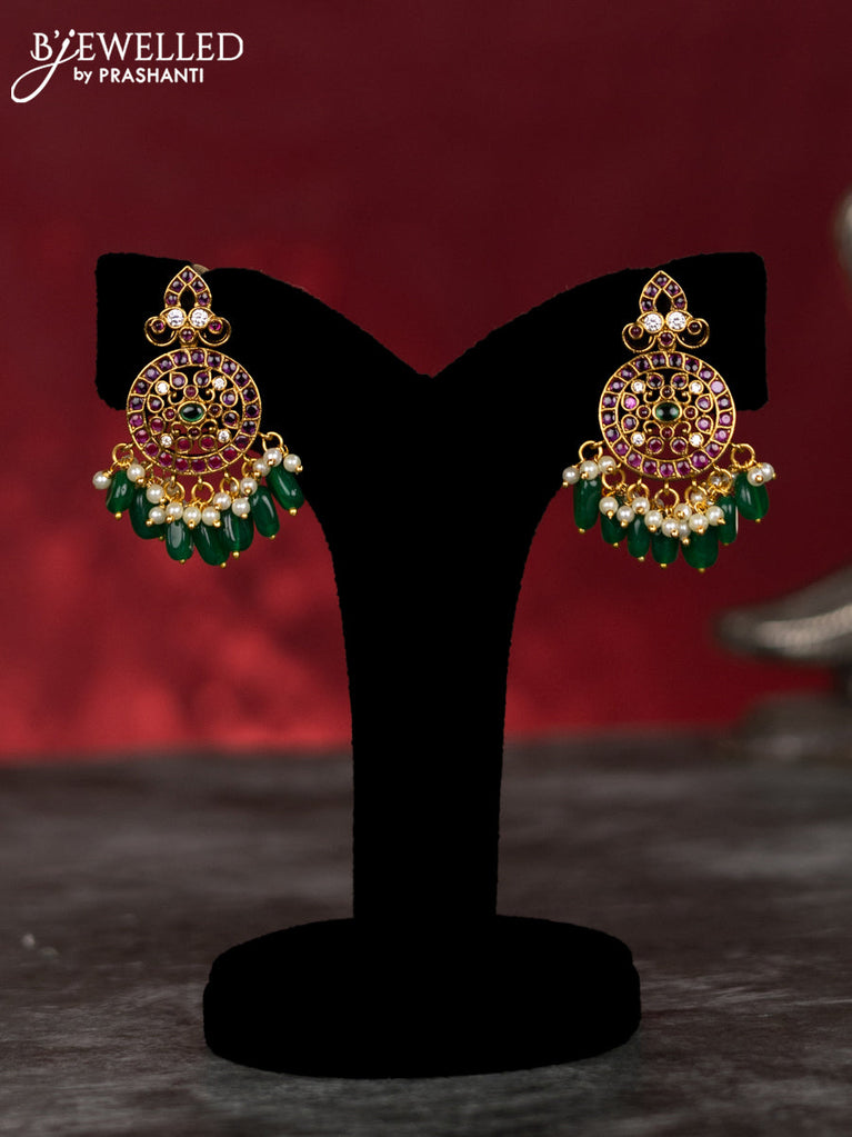 Antique earrings chandbali & lotus design with kemp pachi kundan stones and pearl & green beads hanging