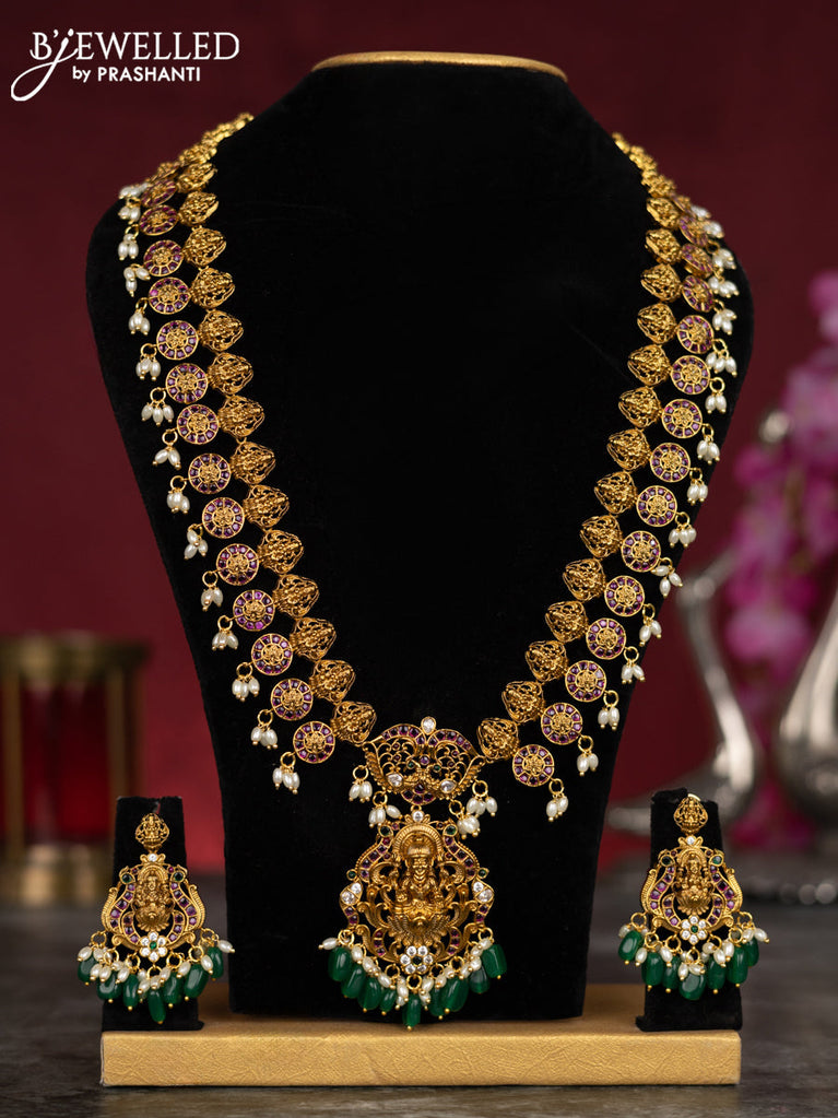 Antique guttapusalu haram lakhmi design with kemp & cz stones and pearl & green beads hangings
