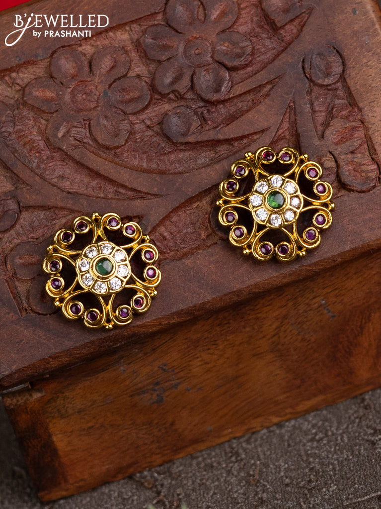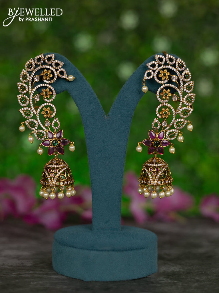 Antique earcuff jhumkas floral design with kemp & cz stones and pearl hangings