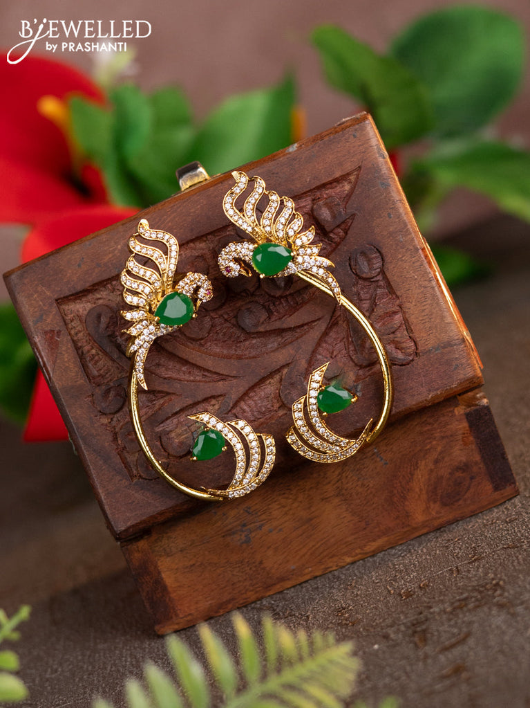 Antique earcuff jhumkas peacock design with kemp & cz stones and pearl hangings