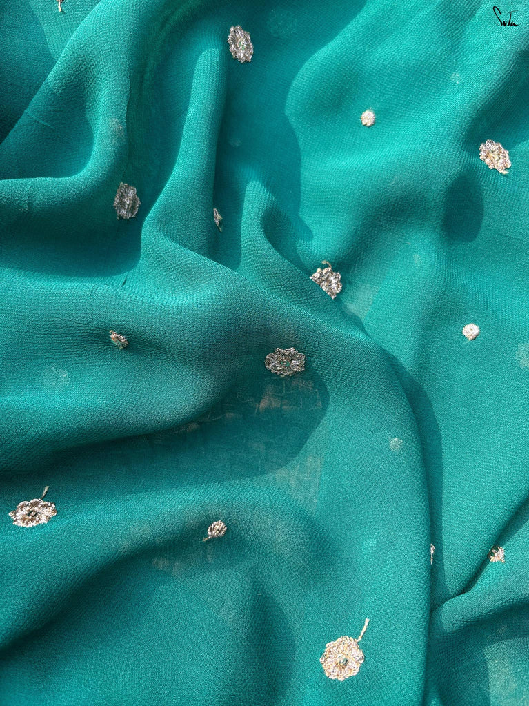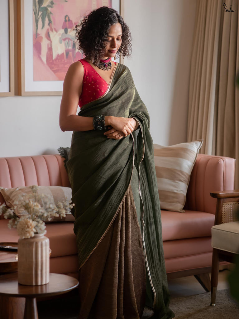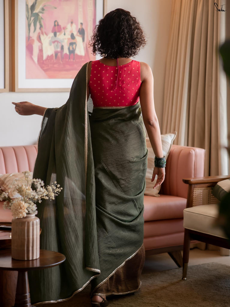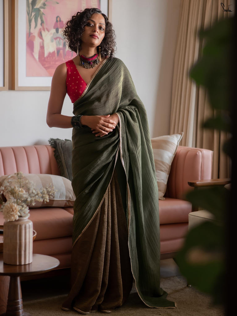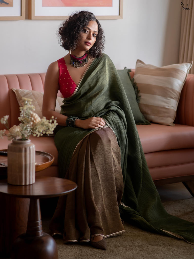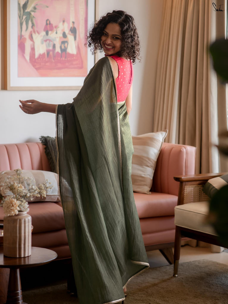 When colours meet with intention, they create their own kind of magic.This crushed viscose zari saree pairs the richness of green with the depth of black, forming a striking contrast that feels bold yet timeless. The crushed texture of the viscose gives the saree a naturally fluid drape, while the decorative gold lace along the borders adds a touch of delicate shimmer.