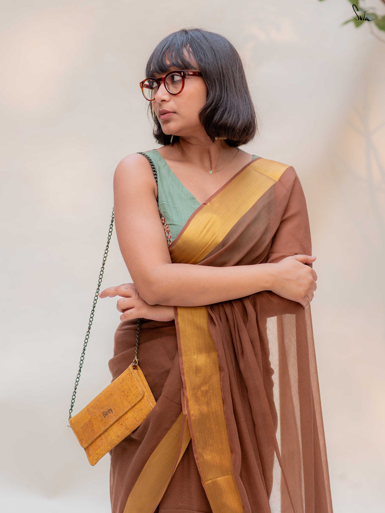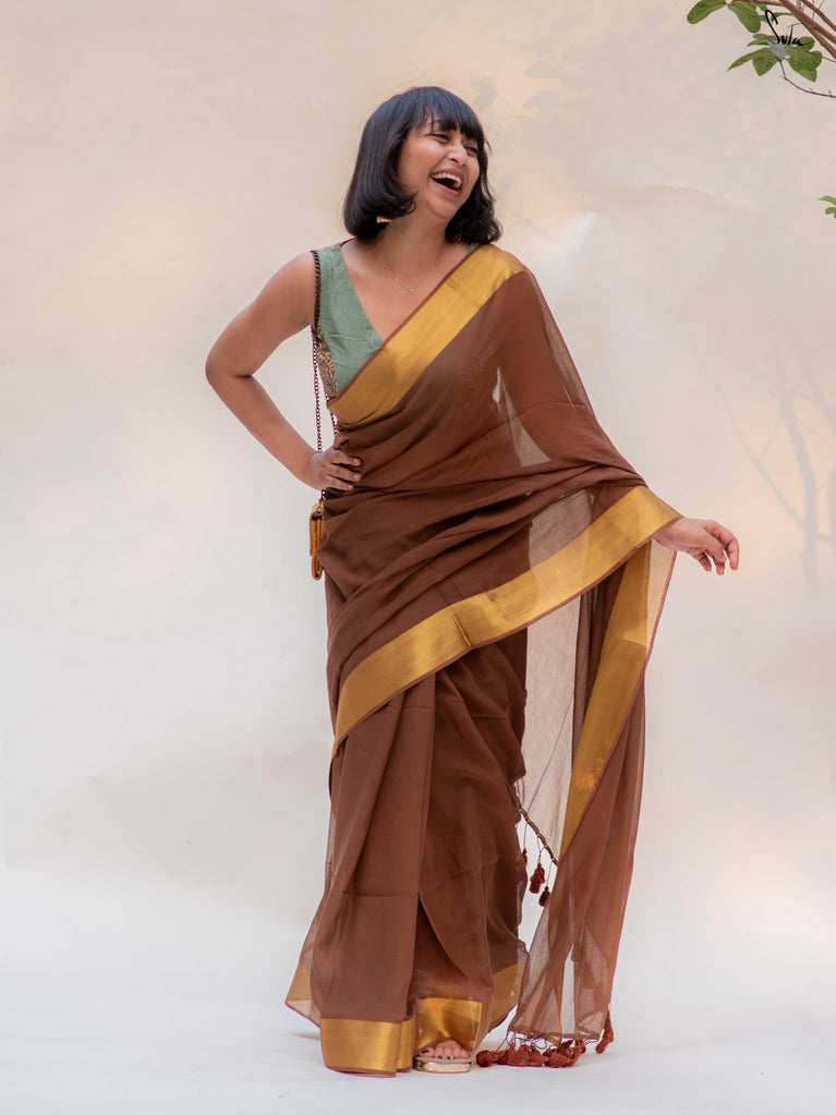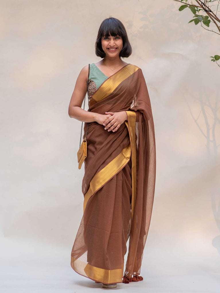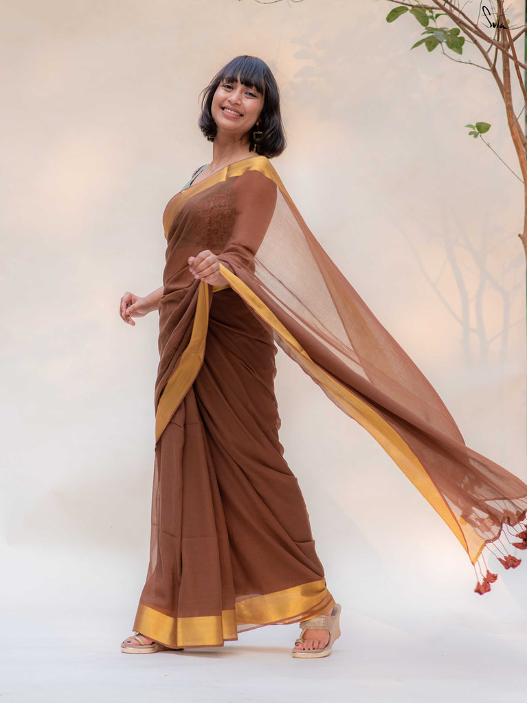 Warm, grounded, and quietly elegant - Clove Phool is summer cotton in a deeper, richer tone. Crafted in airy mul cotton, this brown saree drapes softly and feels feather-light on the skin. A classic gold zari border adds just enough glow, keeping the look timeless and easy.It’s the kind of saree you reach for on long days, slow evenings, and everything in between - effortless, breathable, and endlessly wearable.