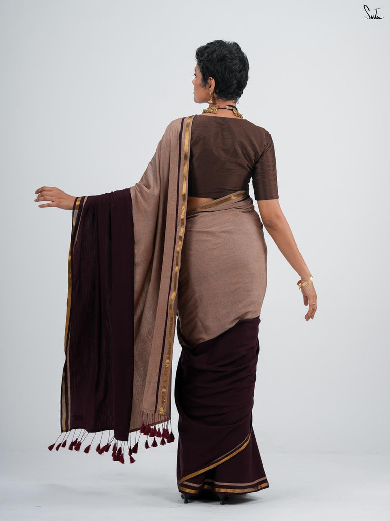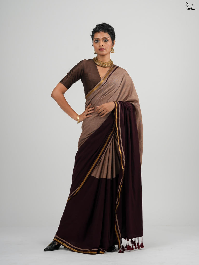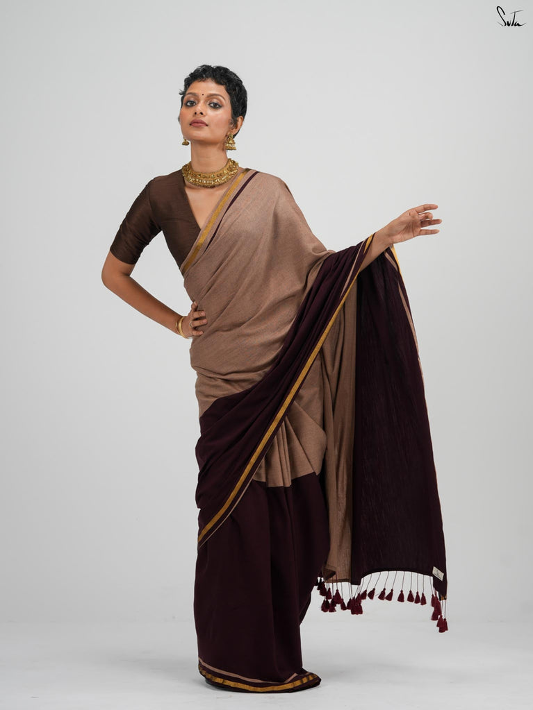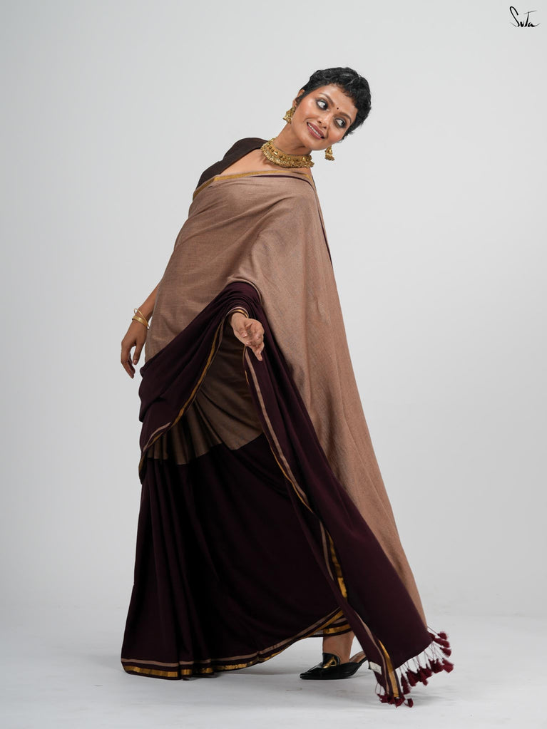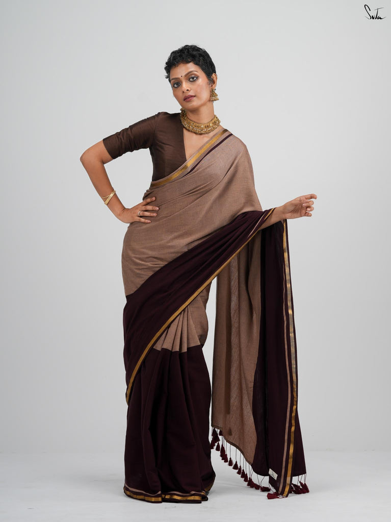 Warm, grounded, and quietly elegant - Clove Phool is summer cotton in a deeper, richer tone. Crafted in airy mul cotton, this brown saree drapes softly and feels feather-light on the skin. A classic gold zari border adds just enough glow, keeping the look timeless and easy.It’s the kind of saree you reach for on long days, slow evenings, and everything in between - effortless, breathable, and endlessly wearable.