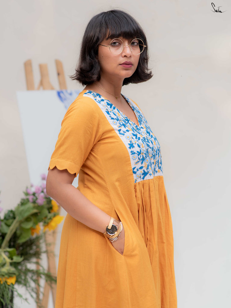 This mustard cotton dress features a contrast hand-embroidered yoke with birds - small details that make you pause and look closer. The V neck keeps it easy, the short sleeves with scalloped edges add a gentle finish, and pockets on both sides make it practical for everyday wear.