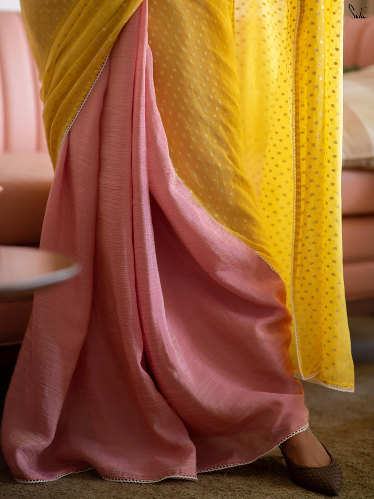 Some colours don’t just meet, they hum together softly. This crushed viscose zari saree pairs the brightness of yellow with the charm of pink, creating a contrast that feels lively and full of warmth. The crushed texture of the viscose lends the saree a beautiful fluidity, making the drape feel effortless and graceful. Decorative gold lace along the borders adds a delicate shimmer, bringing a subtle festive touch to the vibrant colours.