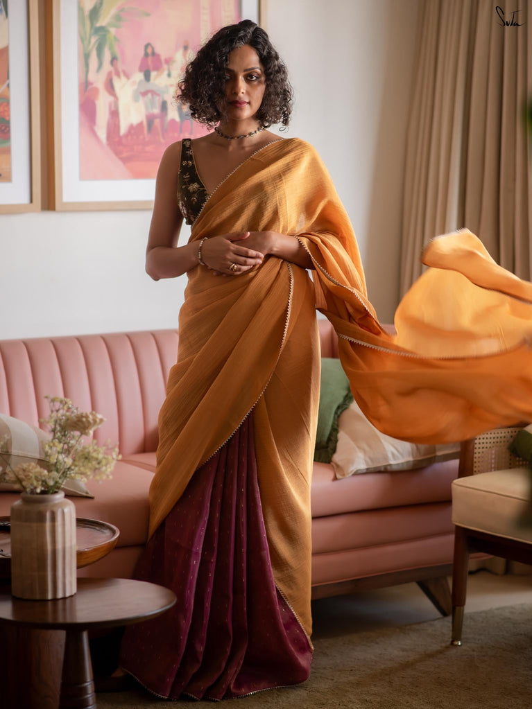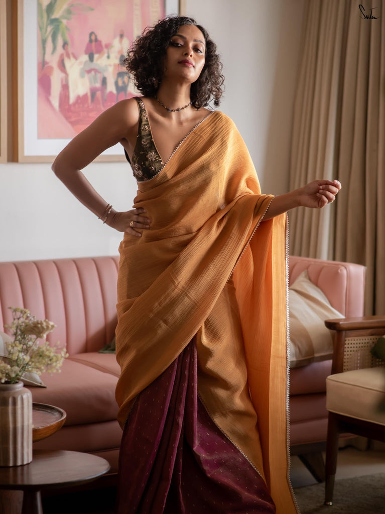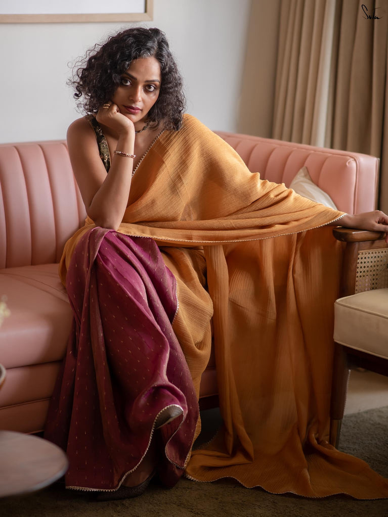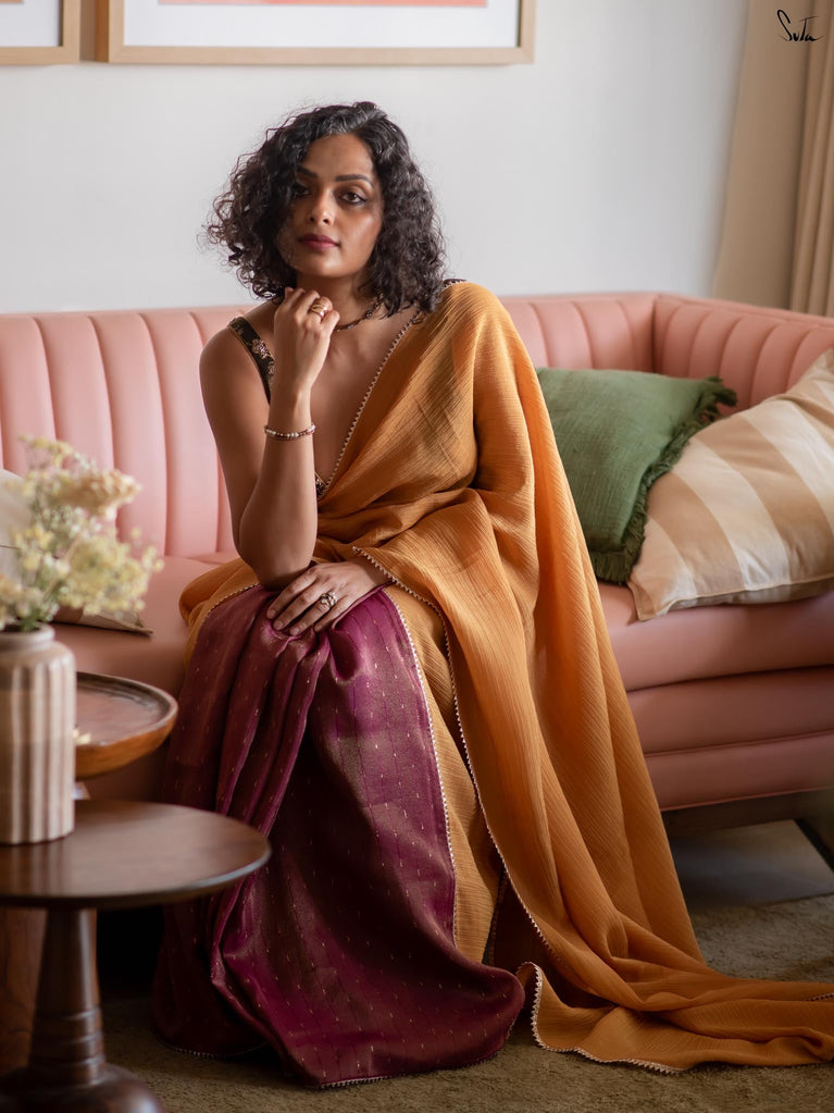 Two colours meet like melodies in conversation. This crushed viscose zari saree brings together the warmth of mustard and the depth of purple, creating a striking contrast that feels both bold and harmonious. The textured crush of the viscose lends the drape an effortless fluidity, while delicate gold lace along the borders adds just the right hint of festive shimmer.