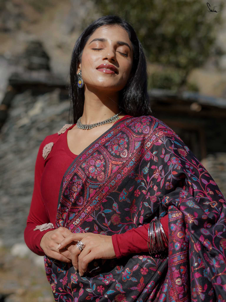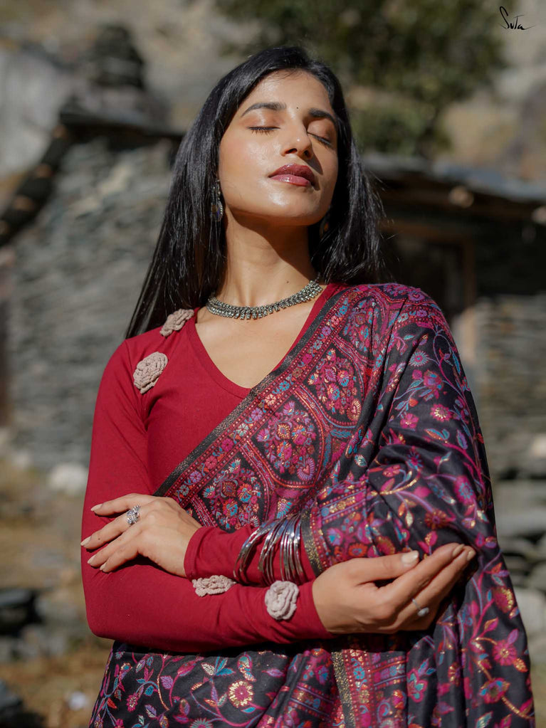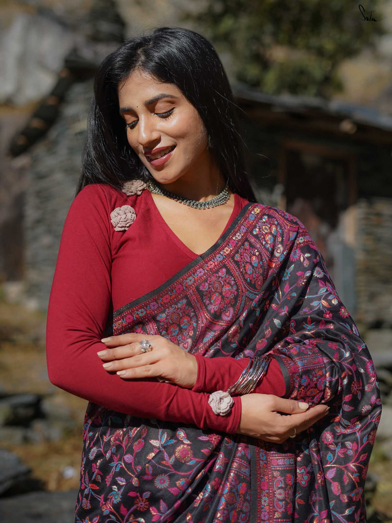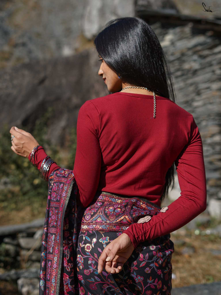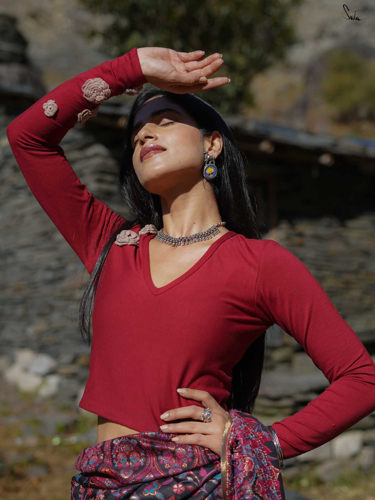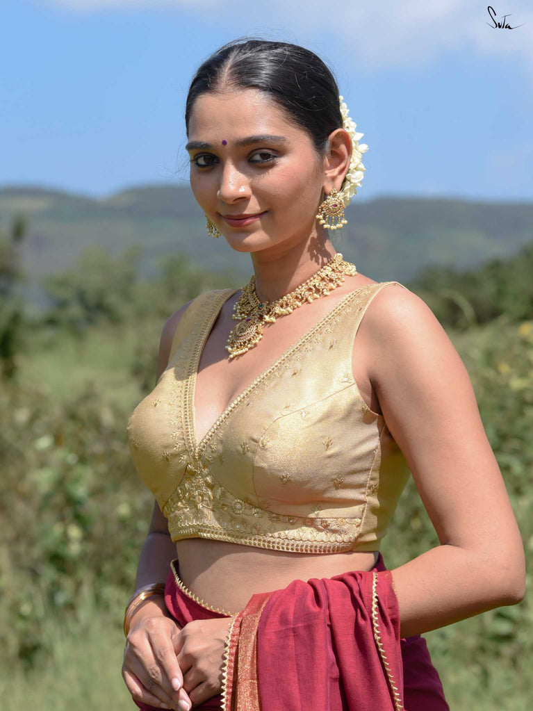 The model is wearing a size S blouse and the saree is Dipped in Wine.