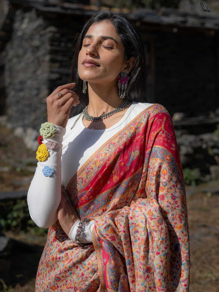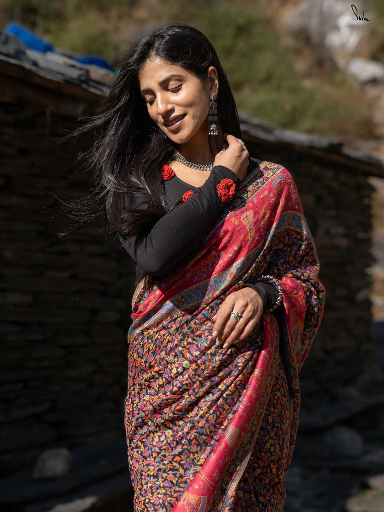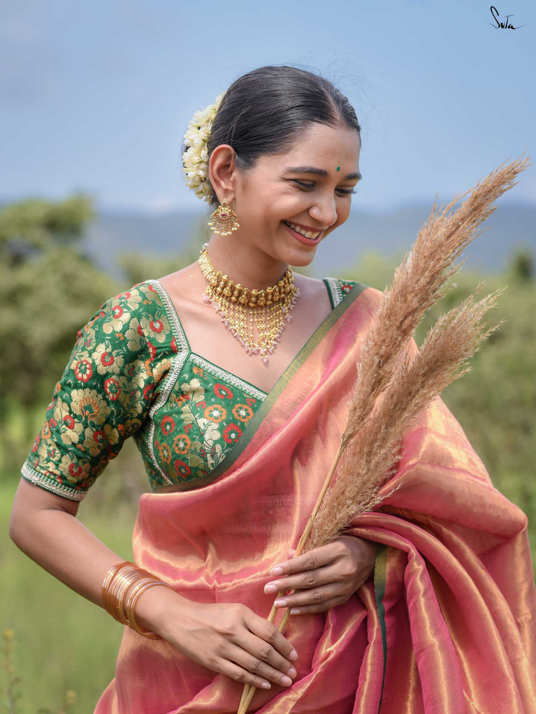 The model is wearing a size S blouse and the saree is Dipped in Gulaab.