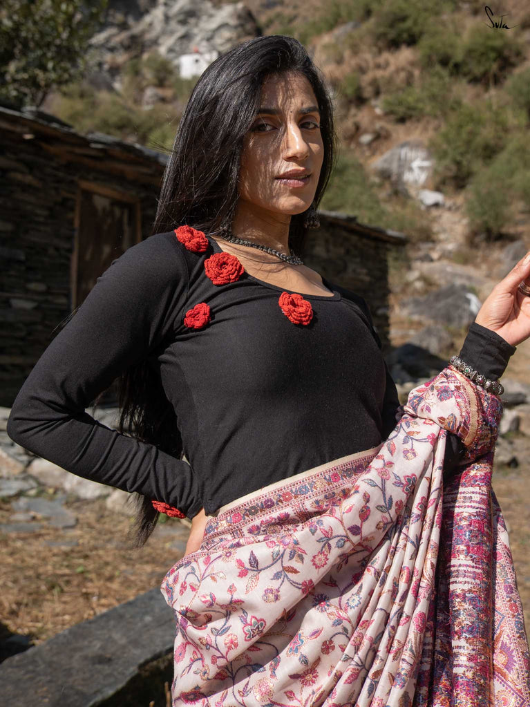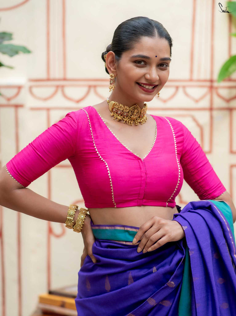 Brishti is one of our most skilled weavers. So many songs have been sung about rain, and we couldn’t think of a better way to honor her magic than in this blouse she made. This pink viscose-blend piece elevates any saree with its flattering V-neck and elbow-length sleeves. Padded and fitted with side elastic, it shapes beautifully while keeping you comfortable.