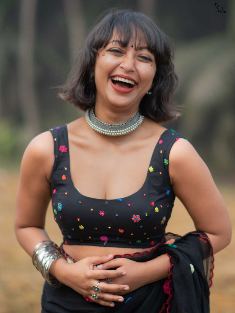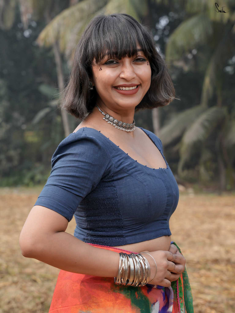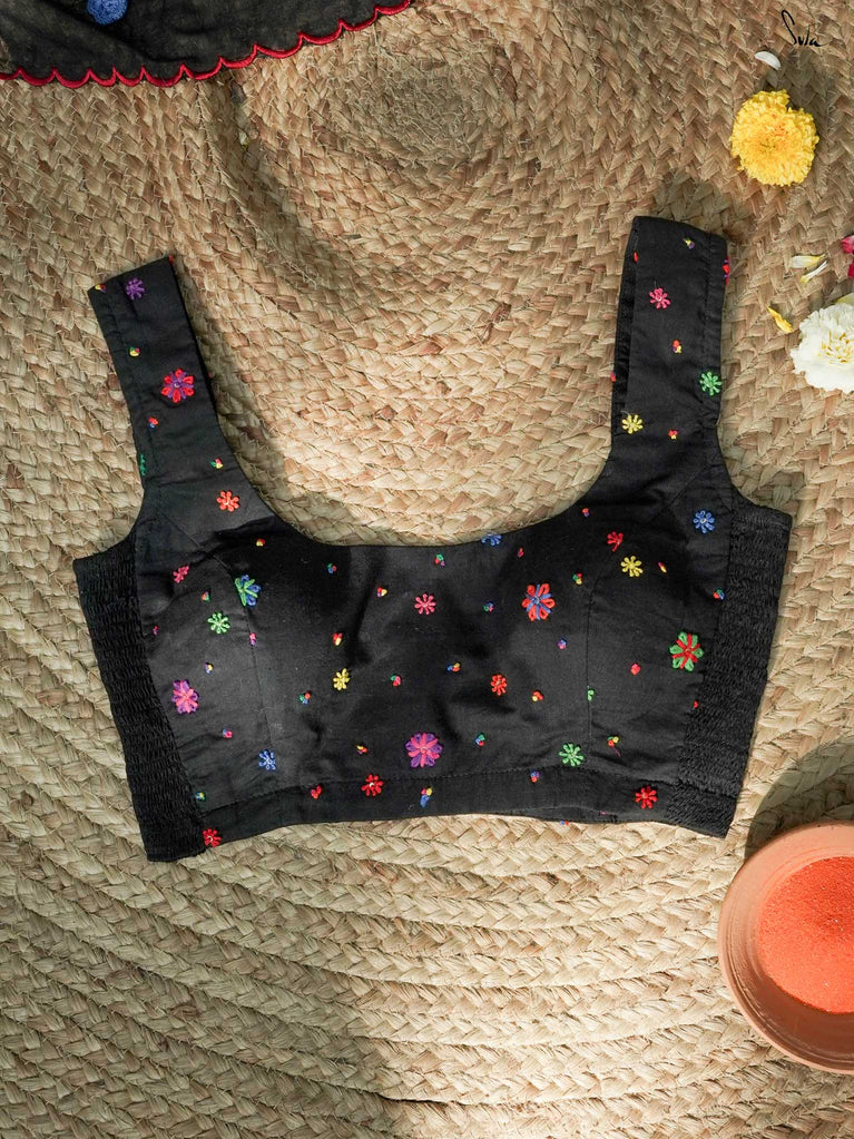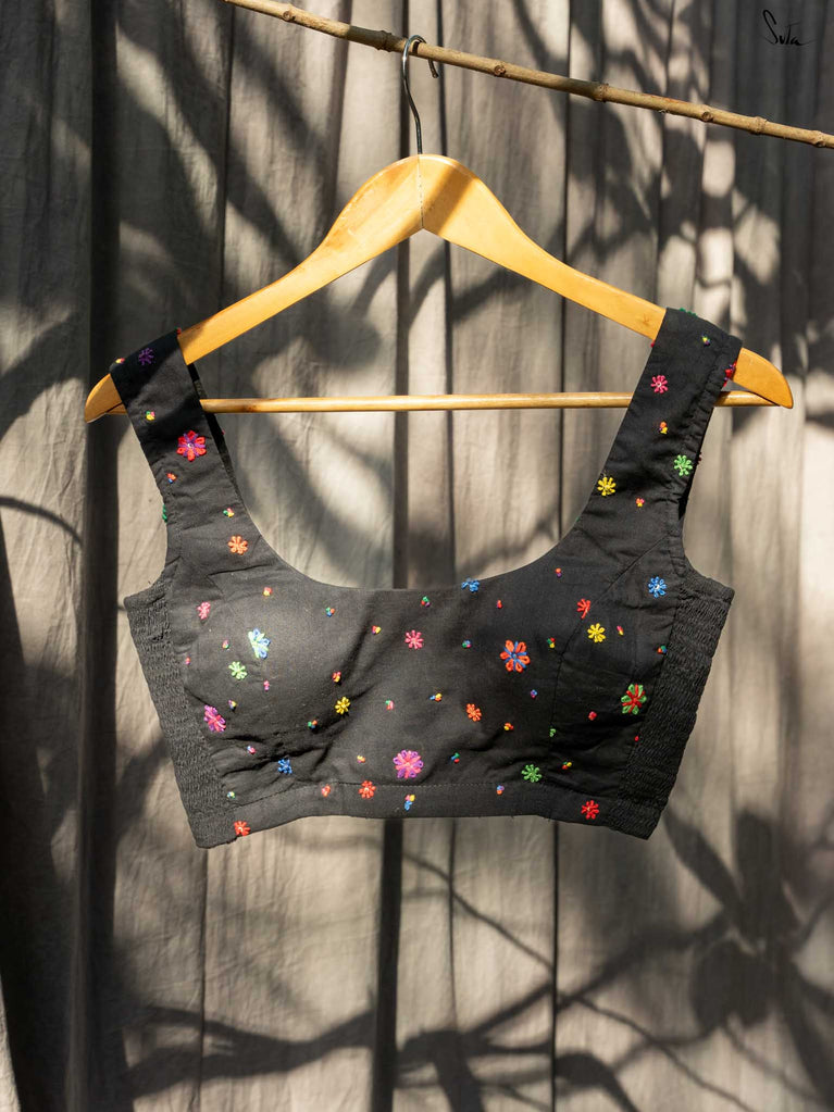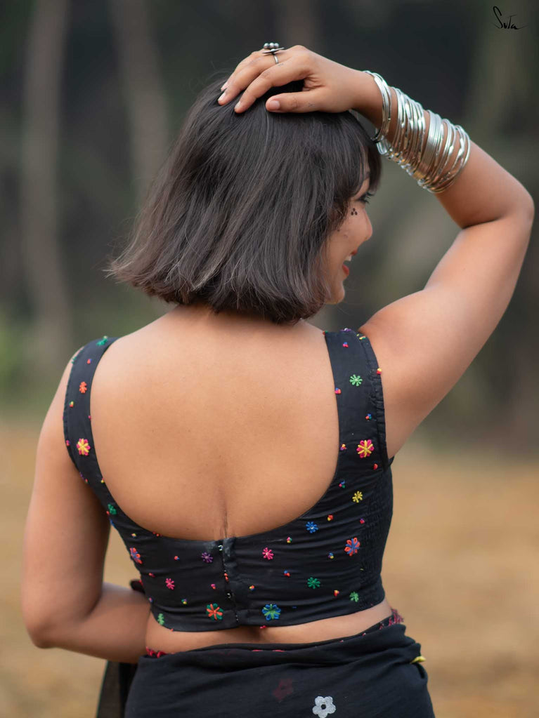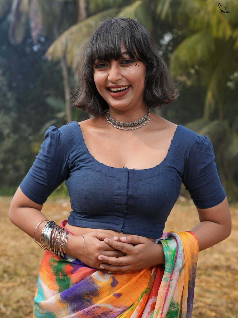 Timeless and graceful, this navy blue half-sleeved cotton blouse is your perfect partner for every Holi. The delicate French knot embroidery speaks of effortless charm, while the sleek U-neck and front hook opening make it as easy to wear as it is stunning. The Elas-Tech fit stretches to hug your body in a perfect fit, allowing you to move and revel in the festivities, wrapped in comfort and beauty. This blouse adapts to your movements, making you feel both stylish and at ease. For the ideal fit, we recommend shopping one size below, as it expands and molds to your body.